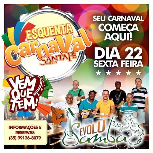 O Buteco Santa Fé promove, nesta sexta-feira, 22 de janeiro, seu “Esquenta Carnaval”, que promete animar a noite de hoje, num espetáculo musical do grupo “EvoluSamba”, muito bem conceituado entre os frequentadores da “vibe” guaxupeana. Intitulado “Vem que Tem”, o evento dos irmãos Nehemy Silva ainda atendem a reservas de mesas, com contatos sendo feitos via telefone (35) 9-9126-8079.