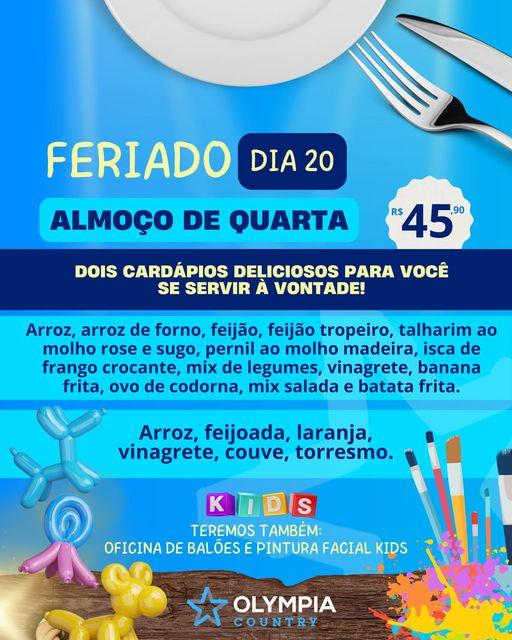 O feriado desta quarta-feira, 20 de novembro (Dia da Consciência Negra) será especial também no Olympia Country, que servirá almoço com dois cardápios (veja os detalhes na parte de fotos desta matéria). Reconhecido por conta da qualidade de seu restaurante, o estabelecimento em questão trabalhará no formato self-service, com comida à vontade por apenas R$ 45,90! Além disso, haverá programação para crianças, com pinturas faciais, brincadeiras com balões, entre outros atrativos (sem contar o parque de diversões com brinquedos eletrônicos). - JÁ PARA esta noite de terça, 19 (hoje!), o Olympia viabilizará show ao vivo com o cantor Emerson Gasp, além de muita curtição. Reservas de mesas (para as duas ocasiões aqui mencionadas) já estão sendo aceitas por meio do telefone whatsapp de número (35) 9-9213-0001.