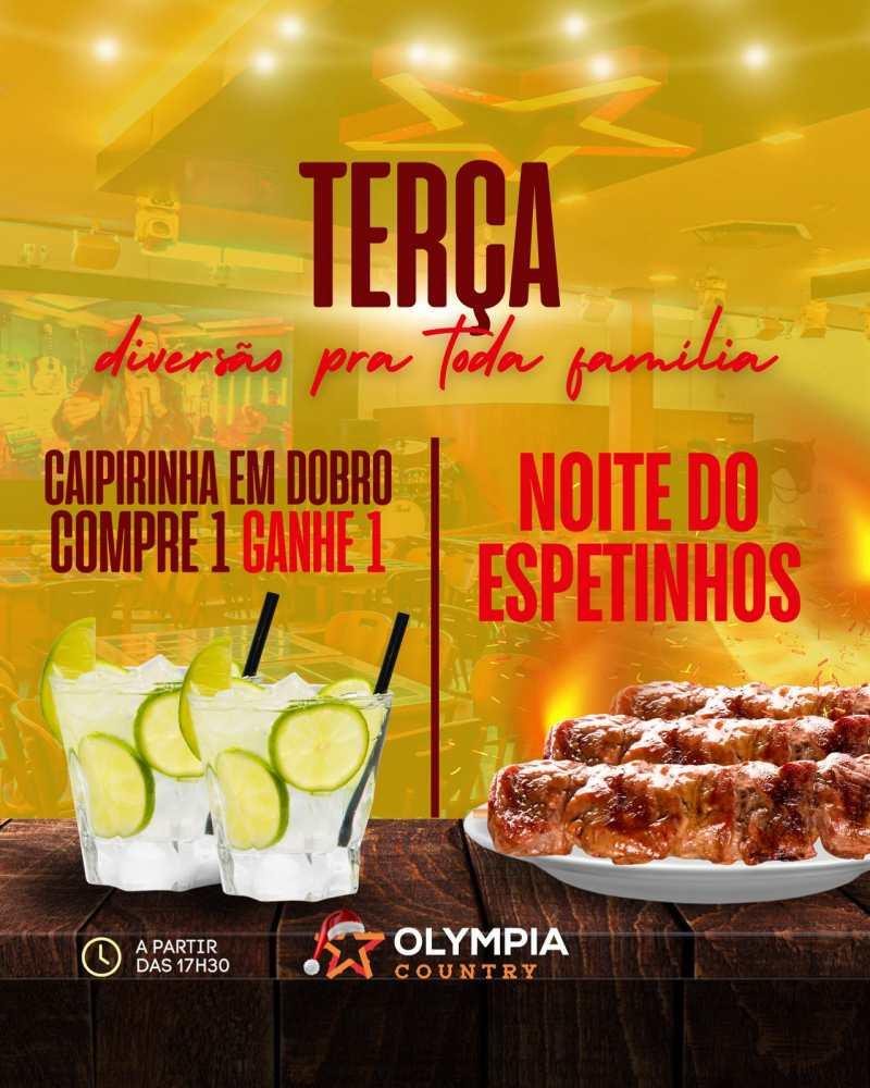 Clientes do Olympia Country aproveitarão, nesta noite de terça-feira, 3 de dezembro, a imperdível promoção "Noite dos Espetinhos, com Capiritinha em Dobro". Iniciada nesta segunda, 2, a programação semanal do estabelecimento se estenderá por todos os dias, com uma série de atrativos.