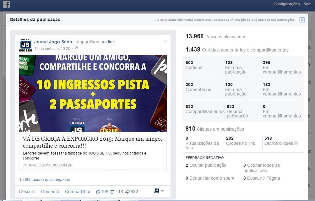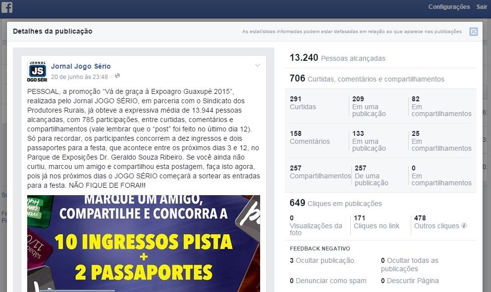 Iniciada em 12 de junho último, a iniciativa do “jogoserio.com.br” alcançou, somente na primeira postagem, o número de 13.968 visualizações, com 503 curtidas, 303 comentários e 632 compartilhamentos (além de 810 cliques em publicações). Já nos segundo e terceiro ‘posts’, publicados em 20 e 21 de junho, houve, respectivamente, uma repercussão de 13.240 visualizações (para 291 curtidas, 158 comentários, 257 compartilhamentos e 649 cliques em publicações) e, depois, mais um alcance de 4.938 (com 109 curtidas, comentários e compartilhamentos; 201 cliques em publicações). - ENCERRADA a partir desta publicação, a promoção terá sua divulgação nesta quarta-feira, 1º de julho.