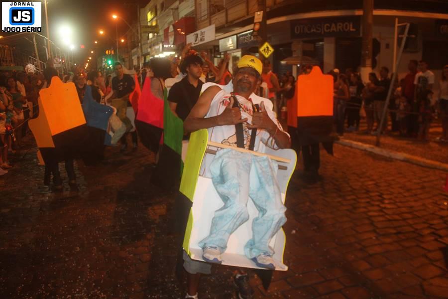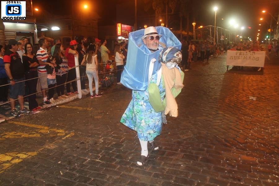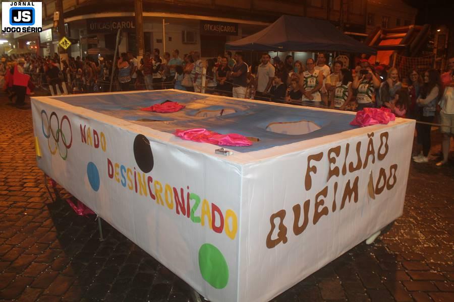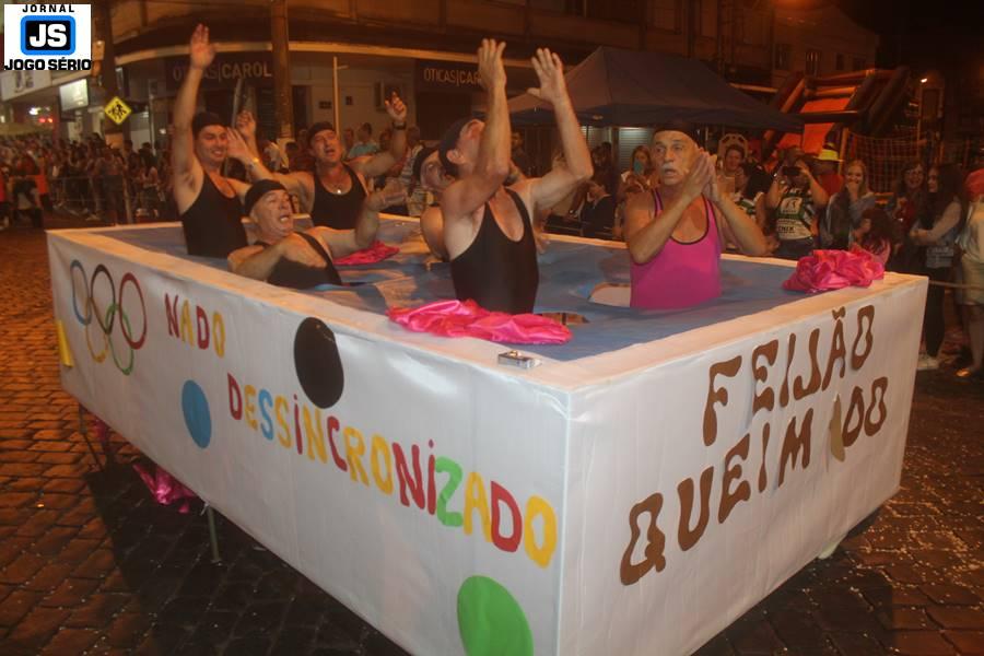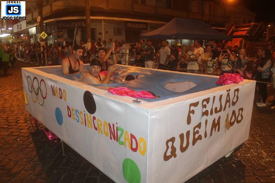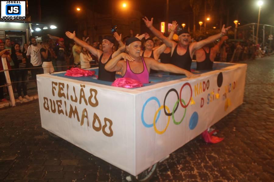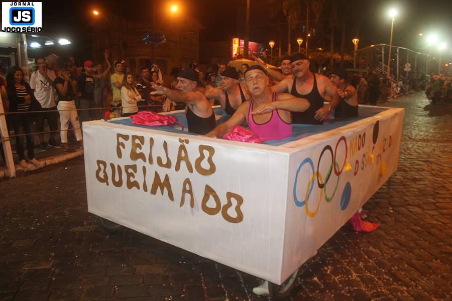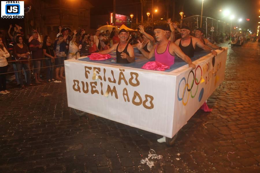 O Feijão Queimado acaba de desfilar no sambódromo do “Carnaval Guaxupé 2017 – cem anos de samba” (agora são 22h15 deste domingo, 26de fevereiro). Habitualmente autêntico, o bloco foi à Avenida Conde Ribeiro do Valle com atuações pitorescas, ao mesmo tempo em que encantou por conta do bom nível e a criatividade de sua apresentação. Com bateria afinada (conduzida por Guilherme Escarassati), alas coloridas e uma “piscina” alusiva aos jogos olímpicos, com equipe em plena performance, o grupo arrancou calorosos aplausos e gargalhadas do público presente. Tradicional na cidade, o “Feijão” relembrou os tempos de ouro do carnaval guaxupeano, quando seus componentes eram caracterizados por comemorarem a Festa de Momo com muita irreverência. – Antes do Feijão Queimado, a segunda noite de desfiles em Guaxupé contou com a exibição da Escola de Samba Fênix, a qual homenageou ao escritor Elias José e as quatro estações climáticas. Ainda hoje, a escola Portal de Minas passará pelo sambódromo, sendo que logo após, no palco principal, a Velha Guarda Show de Bateria Mangueira/RJ e do Batuque do Bem comandam os espetáculos culturais do carnaval. – ACESSE WWW.jornaljogoserio.com.br para saber como está a festança da Secretaria Municipal de Cultura, Esporte e Turismo de Guaxupé.