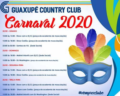 A diretoria do Guaxupé Country Club já divulgou, nesta quarta-feira, 1º de janeiro, a programação oficial de seu "Carnaval GCC 2020". Com atividades empolgantes, que ocorrerão num clima mais do que saudável e agradabilíssimo, a folia acontecerá entre os próximos dias 22 e 25 de fevereiro, com a secretaria já disponível para reservas e prestação de informações gerais sobre o evento. CLIQUE AQUI e confira todas as movimentações!!!