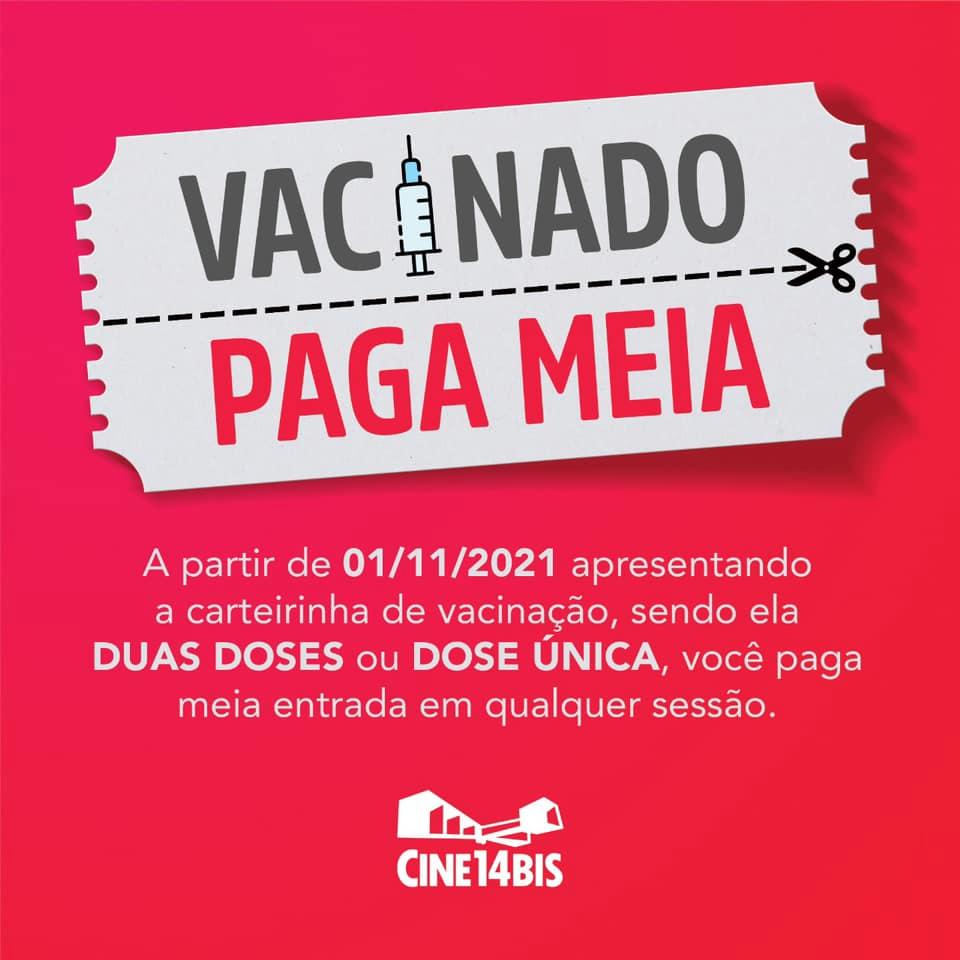 "Olha aí! Quem já tem a vacinação completa (as duas doses tomadas ou a dose única) pode garantir a sua meia-entrada no Cine 14 Bis, apresentando a carteirinha de vacinação", informou o Cinema, por meio de suas redes sociais, onde a veiculação de promoções e novidades é constante.