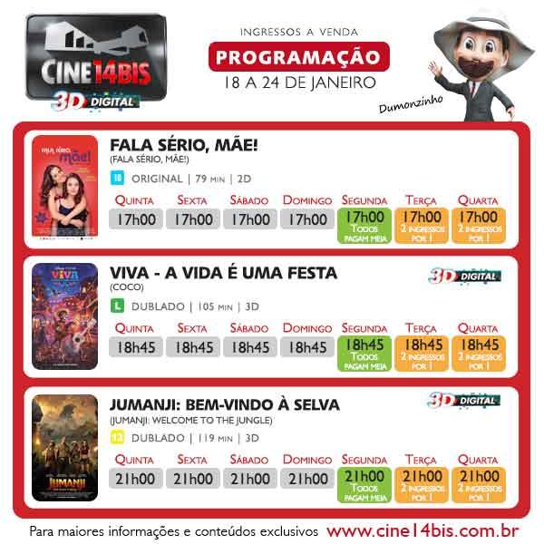 Confira os três filmes em cartaz no Cine 14 Bis, sala de Guaxupé: com censura livre, “Viva, a vida é uma festa” está sendo exibido todos os dias, a partir das 18h45. Também para o público jovem, um pouco mais cedo (às 17h), “Fala Sério, Mãe!” e, ainda à galera ‘teen’, o filme “Jumanji: bem vindo à selva” está sendo transmitido diariamente, às 21 horas. Todos os três super bem sucedidos, os filmes possuem sinopses e outras informações no site oficial: www.cine14bis.com.br. Informe-se, faça sua reserva e garanta horas de diversão, cultura e conhecimento!