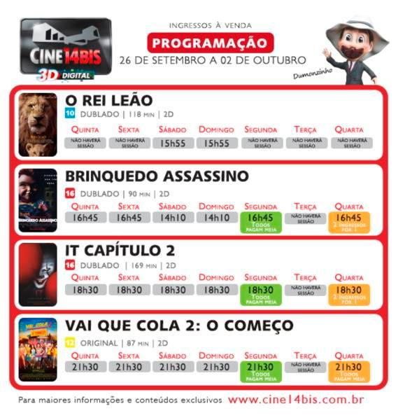 Na lista de filmes selecionados para o grande público estão: "O Rei Leão", aos sábados e domingos, às 15h55; "Brinquedo Assassino", às 14h10 e 16h45; "It Capítulo II", às 18h30, e "Vai que Cola 2 - o começo", às 21h30 (confira a programação no site, a fim de se inteirar sobre as meia-entradas e os dias de exibição dos filmes).