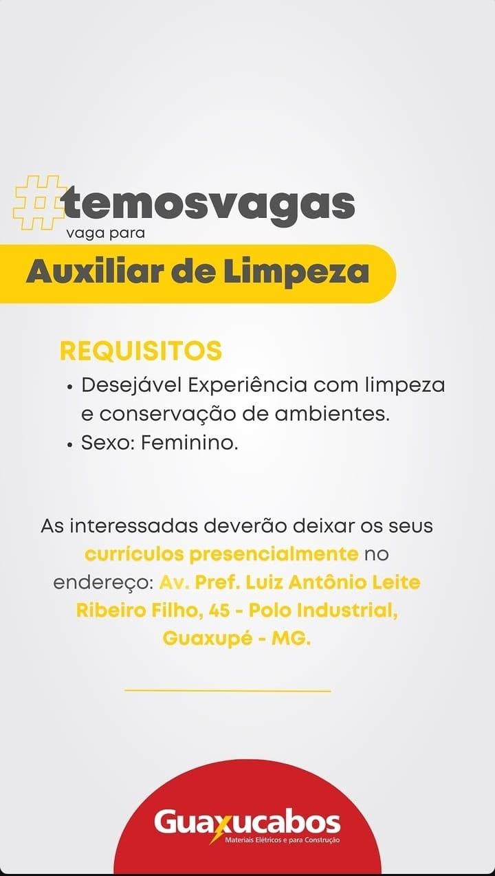 A Guaxucabos, especializada na venda de produtos elétricos, hidráulicos e de materiais para a construção civil, oferta vagas de emprego nas áreas de motorista (do sexo masculino) e auxiliar de limpeza (feminino). Dos requisitos para ambas as funções contam como diferenciais ter experiência na área, ser proativo e organizado. Para os motoristas, será necessário a Carteira Nacional de Habilitação na categoria D. Interessados devem levar seus currículos pessoalmente à firma, que fica na Avenida Prefeito Luiz Antônio Leite Ribeiro, nº 45, no Polo Industrial de Guaxupé.