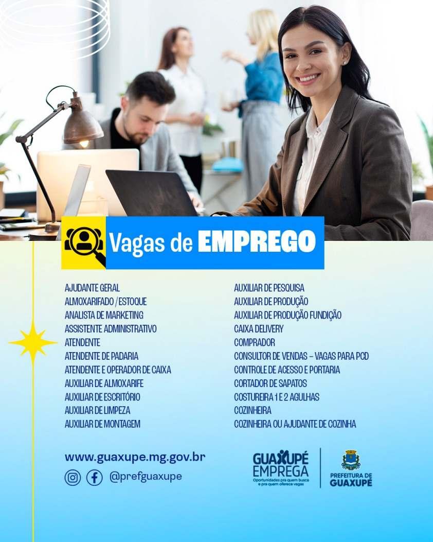 O Programa Guaxupé Emprega, criado há alguns anos pela Secretaria Municipal de Desenvolvimento Econômico, divulga novas vagas de emprego para distintas funções. Os interessados devem se informar melhor na Rua Coronel Joaquim Costa, nº 183, na área central da cidade; ou se informar pelo 9-8862-1595 (clique na parte de fotos desta matéria e veja cada uma das vagas! - AJUDE O jornal que lhe informa a todos os momentos: faça um PIX de qualquer valor para 11.086.919/0001-66. - CLIQUE AQUI e receba os conteúdos do JOGO SÉRIO em seu whatsapp. - NESSE LINK, você passa a seguir a nova fanpage/facebook Jornal JOGO SÉRIO. - A QUALQUER instante, acesse www.jornaljogoserio.com.br e fique muito bem informado.