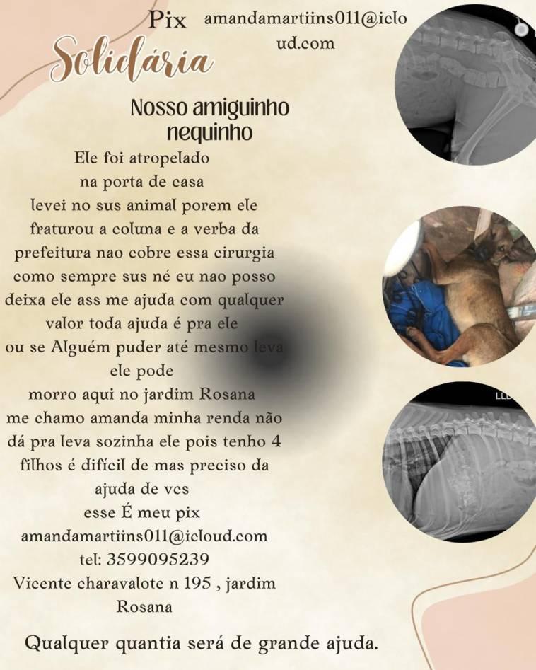 A guaxupeana Amanda Martins, moradora do Jardim Rosana, em Guaxupé, no Sudoeste mineiro, iniciou uma campanha por esses dias, a fim de salvar a vida do cachorro “Neguinho”, que foi atropelado na Rua Vicente Charavallote, no referido bairro, desde quando necessita de cirurgia e outros cuidados médicos. Embora já tenham recorrido ao SUS Animal, os donos do bichinho alegam que ele requer de tratamentos não custeados pelo poder público, o que exige recursos financeiros particulares. Sem condições econômicas no momento, os proprietários tentam amenizar a situação do cãozinho e pedem o apoio da comunidade, no sentido de ajudá-los a pagar as despesas veterinárias. Aos interessados em contribuir, a chave PIX é: amandamartiins011@icloud.com. Mais informações podem ser obtidas junto ao telefone celular de número (35) 9-9909-5239.