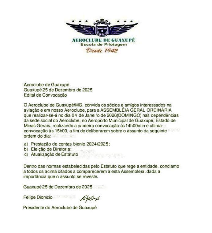 A diretoria do Aeroclube de Guaxupé, no Sudoeste mineiro, divulga, neste conteúdo, edital para a realização de Assembleia Geral Ordinária, cujos temas serão a prestação de contas relativamente ao biênio 2024/25, assim como a escolha dos membros da nova direção executiva e a atualização do Estatuto da entidade. Conforme documento anexado na parte de fotos desta matéria, a reunião ocorrerá no próximo dia 4 de janeiro (de 2026), na sede do Aeroclube, com a primeira chamada programada para às 14 horas e a segunda às 15 horas. Assinado pelo presidente, Felipe Dionísio, o Edital está sendo publicado não só no site oficial do JOGO SÉRIO, mas também em todas as redes sociais do Jornal. - CLIQUE AQUI e veja o edital no Facebook do Jornal JOGO SÉRIO!!! - AJUDE O jornal que lhe informa a todos os momentos: faça um PIX de qualquer valor para 11.086.919/0001-66. - CLIQUE AQUI e receba os conteúdos do JOGO SÉRIO em seu whatsapp. - NESSE LINK, você passa a seguir a nova fanpage/facebook Jornal JOGO SÉRIO. - A QUALQUER instante, acesse www.jornaljogoserio.com.br e fique muito bem informado.
