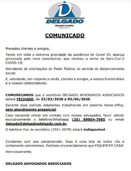 O Delgado Advogados Associados, que fica na Avenida dos Inconfidentes, na área central de Guaxupé, emitiu nota oficial para informar o encerramento temporário das atividades, em decorrência do combate ao Coronavírus na cidade. De acordo com os membros da referida organização, o expediente foi encerrado nesta segunda-feira, 23 de março, com previsão de reabertura em 5 de abril próximo. Até então, o escritório manterá atendimento remoto, com o contato via whatsapp (35) 9-9904-7995 e o email delgado@delgadoedelgado.com.br (o telefone fixo da empresa estará desativado por este período). "Contamos com sua compreensão. Fique em casa! Todos contra o Coronavírus", definiu a nota oficial. (Veja, na parte de fotos desta matéria, o comunicado oficial da Delgado Advogados Associados).