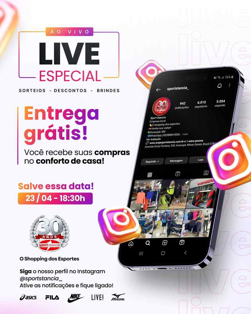 A equipe de vendas da Sport Stancia, em Guaxupé, no Sudoeste mineiro, realizará uma "live" especial às 18h30 desta terça-feira, 23 de abril. A iniciativa, cuja transmissão será feita via perfil da loja no Instagram (@sportstancia_), incluirá tênis com marcas como Nike, Mizuno, LIVE Fitness e outras. Tudo com descontos incríveis, a ocasião constará, ainda, de muitos benefícios e sorteios de brindes (sem falar numa grande surpresa para o Dia das Mães!). De acordo com a organização, os produtos serão enviados em domicílio, sem taxa de entrega, para clientes de Guaxupé. Com duas lojas físicas na cidade, a Sport Stancia está entre as principais do País, com mais de trinta anos de atividades e todas as marcas em roupas, calçados e acessórios fitness, esportivos e outros. CLIQUE AQUI e saiba mais!