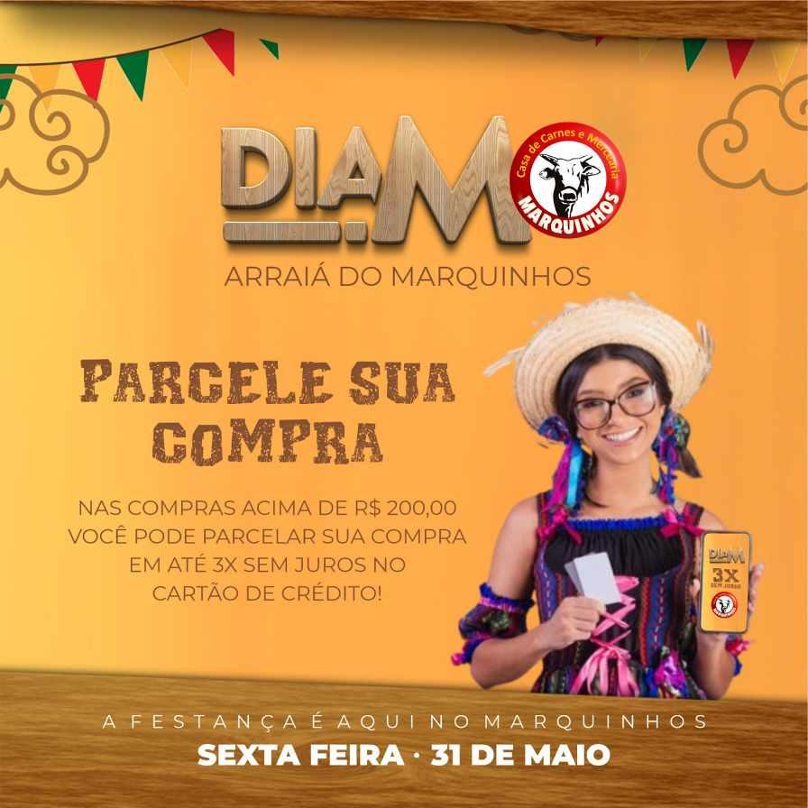 A Casa de Carnes e Mercearia Marquinhos promoverá, durante todo o expediente desta sexta-feira, 31 de maio, o "DIA M - Arraiá do Marquinhos". Conforme habitual, nesse dia, o estabelecimento comercializa seus produtos e serviços a preços imbatíveis (principalmente no setor de carnes)! Além das ofertas em itens variados, clientes poderão parcelar o pagamento de suas compras em até três vezes, no cartão de crédito (para compras efetuadas na loja matriz, com valores acima de R$ 200,00). Numa iniciativa totalmente voltada aos clientes e amigos, haverá, além disso, degustações e sorteio (kit-churrasco para compras acima de R$ 100,00). Visite o Marquinhos, que fica na Rua Manoel Antônio de Araújo, na área central de Guaxupé, que fica na região Sudoeste mineira. Se precisar, informe-se mais no (35) 9-9208-7160.