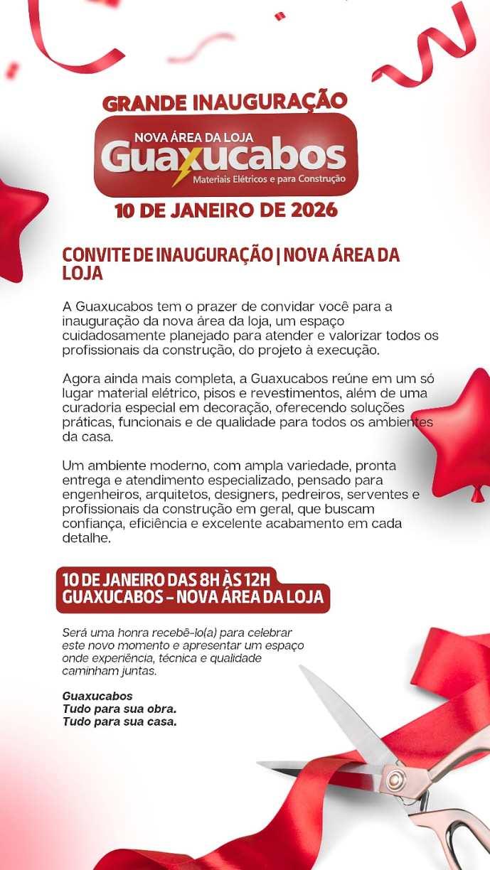 A Guaxucabos, especializada na venda de produtos da construção civil, em geral, encontra-se às vésperas de inaugurar seu novo showroom. Já referência regional em função da qualidade de seus produtos, entre outros benefícios, o estabelecimento da empresária Cristina Maria Pasqua Heluany Barbosa ficará 600m² maior e muito melhor. Assim, haverá ainda mais variedade, conforto e uma experiência completa à clientela.