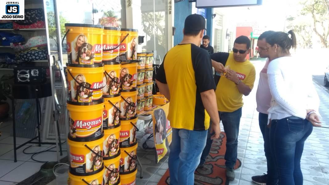 A visita da Magnus constou da montagem de um estande na calçada da loja, onde o representante, Maurílio, interagiu com o público durante o tempo todo: "Temos linhas completas para cães e gatos, desde o formato "stander" até a linha "super premium", que é a "top". Além disto, trabalhamos com as marcas "Origens", "Fort-cão", entre outras, para animais adultos, filhotes, da terceira diade ou que estejam com problema de obesidade", comentou o técnico, que distribuiu brindes e interagiu com o público por meio da transmissão ao vivo do Jornal JOGO SÉRIO.
