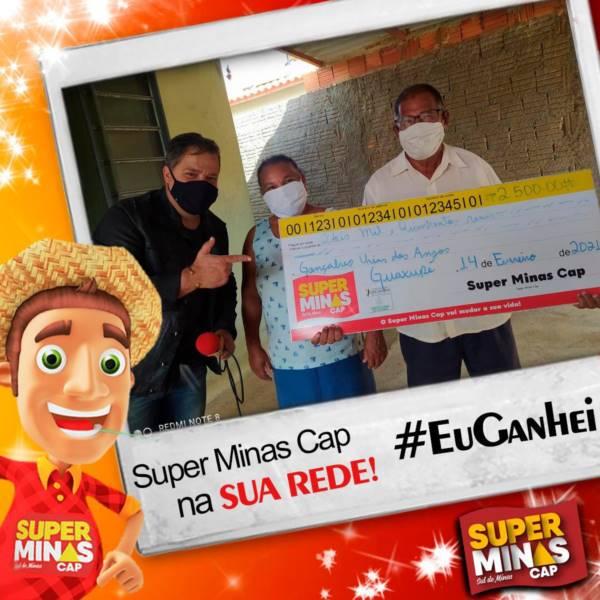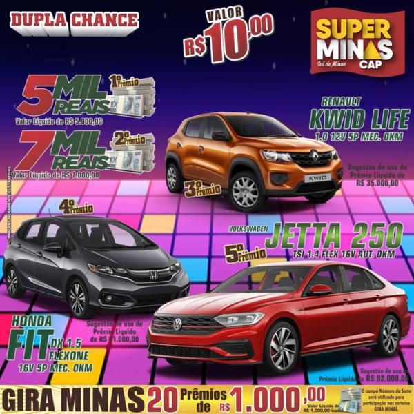 Para esta semana, o Super Minas Cap está ainda mais irresistível, com R$ 5 mil em dinheiro no 1º prêmio, R$ 7 mil no 2º, um Renault Kwid Life 1.0 12v 5p no 3º; um Honda Fit 1.5 flex one 16v 5p no 4º prêmio, um Volkswagen Jetta 250 TSI 1.4 flex 16v no 5º prêmio; e mais vinte premiações no valor de R$ 1 mil no "Gira Minas". Ah! E você não pode perder a oportunidade de colaborar com o centro de oncologia de Alfenas e concorrer , pois a cartela desta semana está só R$ 10,00. Aproveite e retire a sua num dos pontos de vendas ou com os vendedores ambulantes.
