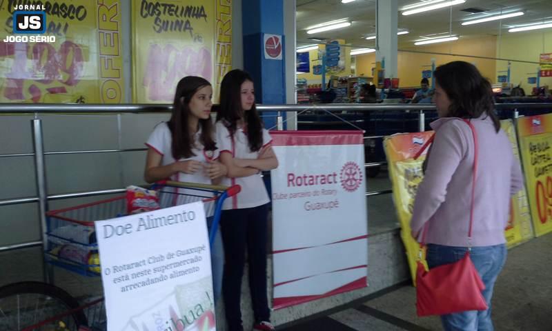 Integrantes do Rotaract Club de Guaxupé realizaram, no último dia 25, uma campanha de arrecadação de alimentos em supermercados da cidade, tendo conseguido as expressivas marcas de 274,870kg alimentos e 262 litros de leite obtidos (Feijão: 45 kg; Óleo: 54 litros; Arroz: 84 kg; Macarrão: 35,8 kg; Açúcar cristal: 15 kg; Açúcar refinado: 4 kg; Pó de café: 1,5 kg; Farinha de trigo: 18 kg; Farinha de mandioca: 500g; Farinha de milho: 500g; Fubá: 2,5; Bolachas: 2,6 kg; Milho de pipoca: 500g; Milho em conserva: 900g; Molho de tomate: 6 kg; Sal: 5 kg; Leite: 262 litros). Divididos em equipes, os voluntários visitaram as lojas do São João Supermercados (Avenida Floriana e Rua Mancini), Tonin supermercados (Avenida Conde Ribeiro do Valle e Auto Atacado) e Uni 10 (Avenida dos Inconfidentes). De acordo com os organizadores, os alimentos serão doados a instituições da cidade, sendo que em breve haverão outras iniciativas desta natureza. Presidido por Daniele Cristina Mariano e ligado ao Rotary Club Guaxupé, o Rotaract desencadeia, ainda, uma série de outras atividades, como a campanha de lixo eletrônico, ocorrida há pouco, em pontos estratégicos do Município.