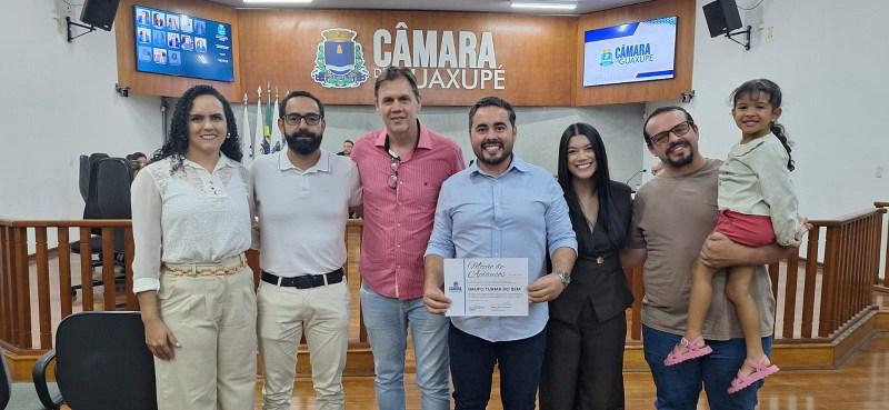 Tales Costa e membros de sua equipe foram recebidos no Legislativo durante a 7ª Sessão Ordinária, a qual contou com a participação dos treze vereadores. Na Tribuna, o homenageado detalhou iniciativas concretizadas, externou sua gratidão à honraria e destacou a importância de mais pessoas se unirem à Turma do Bem: “Recebo essa Moção de Aplausos com muita gratidão, mas com a certeza de que ela não é só minha e sim pertence a todos que fazem parte da Turma do Bem, cujo projeto nasceu em abril de 2022, quando criei um grupo de amigos unidos pelo desejo de ajudar a comunidade de Guaxupé. Juntos, já doamos mais de R$ 50 mil às instituições de Guaxupé, materiais escolares cestas básicas, roupas”, informou o voluntário.