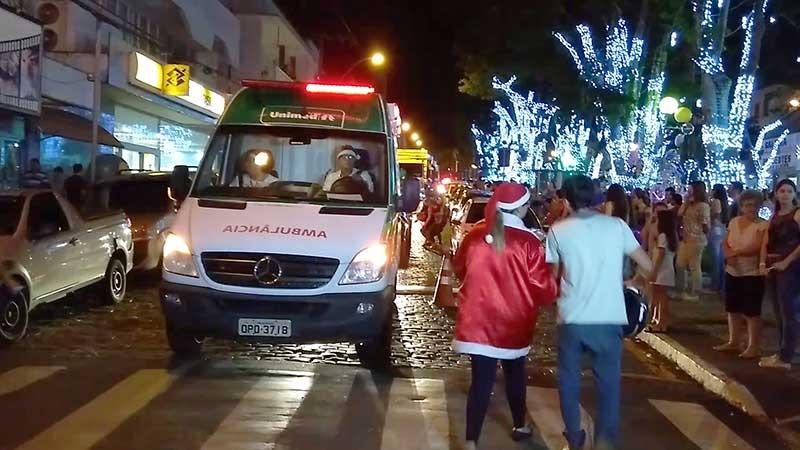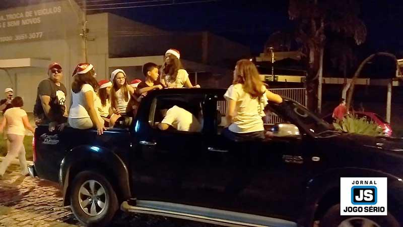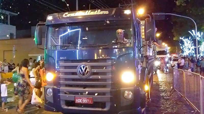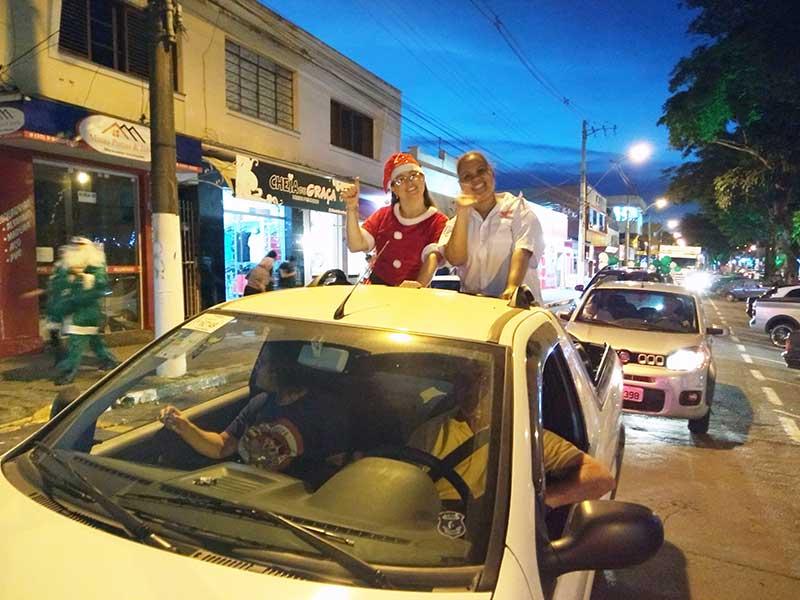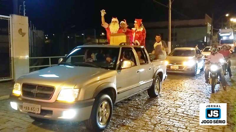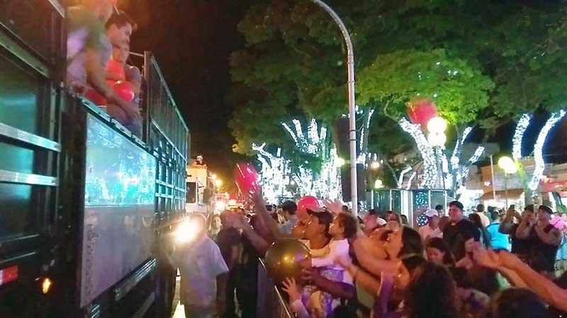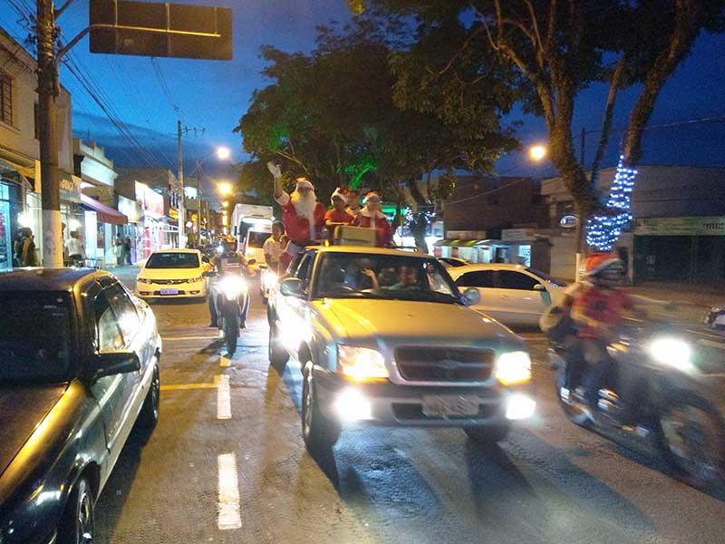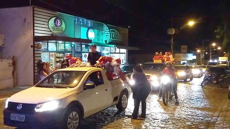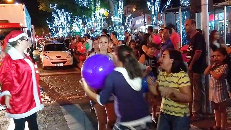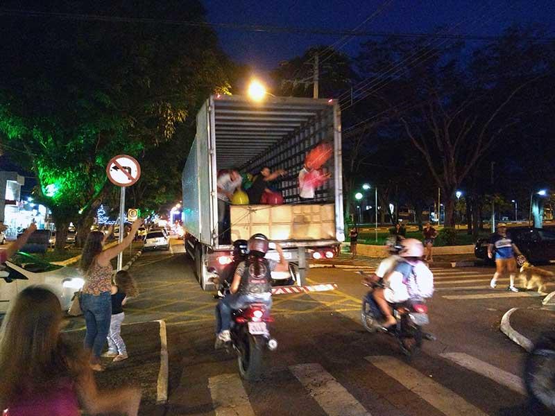 Um extenso grupo de voluntários em Guaxupé participou, nesta tarde de quarta-feira, 19 de dezembro, da distribuição de doze mil e trezentas bolas infantis e mil quilos de balas, numa ação filantrópica que já dura alguns anos e mobiliza doadores de dentro e fora da cidade. A iniciativa, que habitualmente atrai multidões entre crianças e adultos, mais uma vez percorreu boa parte da cidade, tendo confirmado a generosidade dos organizadores. A reunião contou com um comboio de quinze veículos pesados, entre caminhões e carretas, além de automóveis e motocicletas. Abastecidos com os presentes (bolas e balas), eles formaram uma longa fila, sendo que desde o ponto de partida, vários “Papais-noeis”, seus ajudantes e outros personagens alegraram as pessoas por onde o grupo passava. Ao som de trio-elétrico, o passeio contagiava a quem quer se fosse, pelas ruas e avenidas de Guaxupé. “Todos os anos a gente espera por este momento. É muito gostoso ver o quanto as pessoas se sensibilizam com o Natal”, disse a dona de casa Andreia Silva, do Parque dos Municípios I, um dos locais de maior concentração de crianças, à espera dos presentes. Com empresas privadas, instituições, entidades de classes e representantes de vários segmentos, a carreata natalina transcorreu em clima de paz e doação.