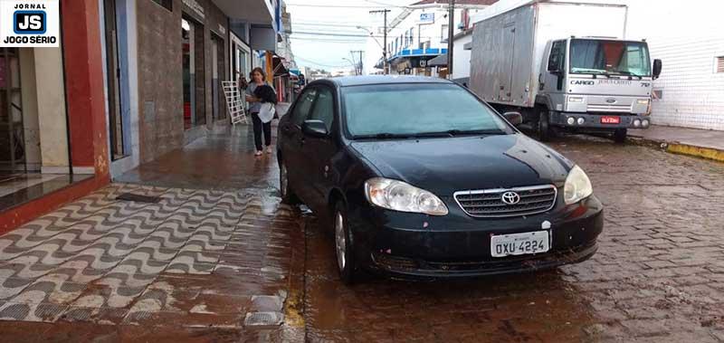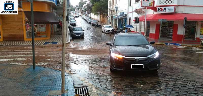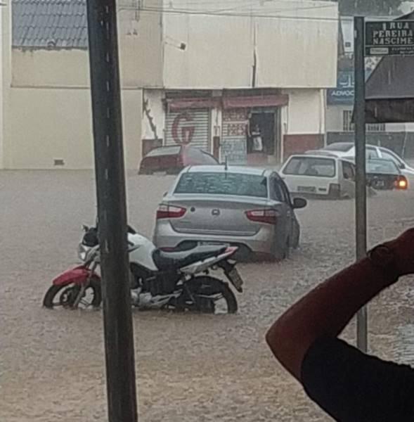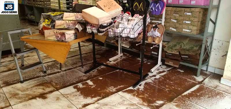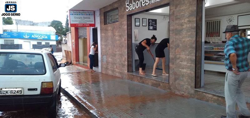 O temporal, que começou às 15h45, veio com muita água, ventania, raios e trovões, tendo, em pouco tempo, alagado a Rua Dr. Antônio dos Santos Coragem, que abriga um complexo comercial, onde a enxurrada invadiu boa parte dos estabelecimentos, adentrou veículos estacionados e gerou um corre-corre: "Não deu tempo para nada! Perdemos, até agora, 320 pares de calçados", lamentou o comerciante Laudaci Ribeiro (Chimbica), da Tropical Calçados. "Não sabemos quantas canecas d"água já tiramos do carro, que está enssopado por dentro", disse a empresária Patrícia Zampar, proprietária de um Honda preto.