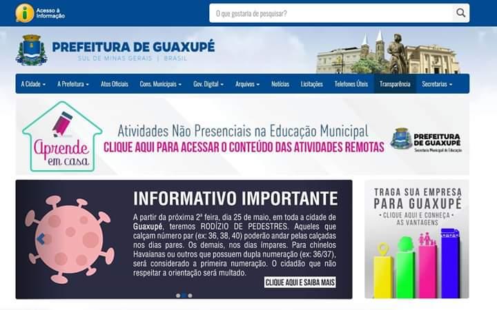 Uma arte/banner confeccionada aos moldes da página inicial do site da Prefeitura de Guaxupé tem circulado pelas redes sociais nesta tarde de quinta-feira, 21 de maio, com um conteúdo no mínimo atípico e surpreendente. Se já não bastassem os estados de preocupação, incerteza e o medo pelos quais passam os cidadãos, em função dos riscos de contaminação pelo Novo Coronavírus (que já matou mais de 17 mil pessoas no Brasil), autores ainda não identificados espalharam a falsa notícia de que o Município passará a adotar uma espécie de rodízio à locomoção de pedestres pela cidade (com a classificação por meio do número do calçado da pessoa). Contudo, a postagem não tem nenhuma procedência.