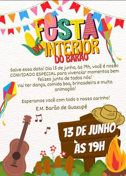 A tradicional "Festa do Interior do Barão" já tem data marcada e promete muita animação para a comunidade de Guaxupé. O evento será realizado no dia 13 de junho, às 19h, na Escola Municipal Barão de Guaxupé, e todos estão convidados a participar desse momento especial.
