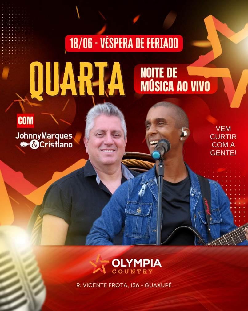 A dupla Johnny Marques e Cristiano se apresentará nesta quarta-feira, 18 de junho, no Olympia Country, cuja casa de shows está entre as mais bem conceituada da macrorregião do Sul de Minas Gerais. Além da música ao vivo, o estabelecimento oferta ambiente agradável, serviço completo de bar, restaurante e uma super área kids para suas crianças divertirem-se sob os olhares atentos de monitores. Visite o local, que fica na Rua Vicente Charavallote, nº 136, no Jardim Angola. Se precisar, informe-se mais no (35) 9- 9213-0001. - AJUDE O jornal que lhe informa a todos os momentos: faça um PIX de qualquer valor para 11.086.919/0001-66. - CLIQUE AQUI e receba os conteúdos do JOGO SÉRIO em seu whatsapp. - NESSE LINK, você passa a seguir a nova fanpage/facebook Jornal JOGO SÉRIO. - A QUALQUER instante, acesse www.jornaljogoserio.com.br e fique muito bem informado.
