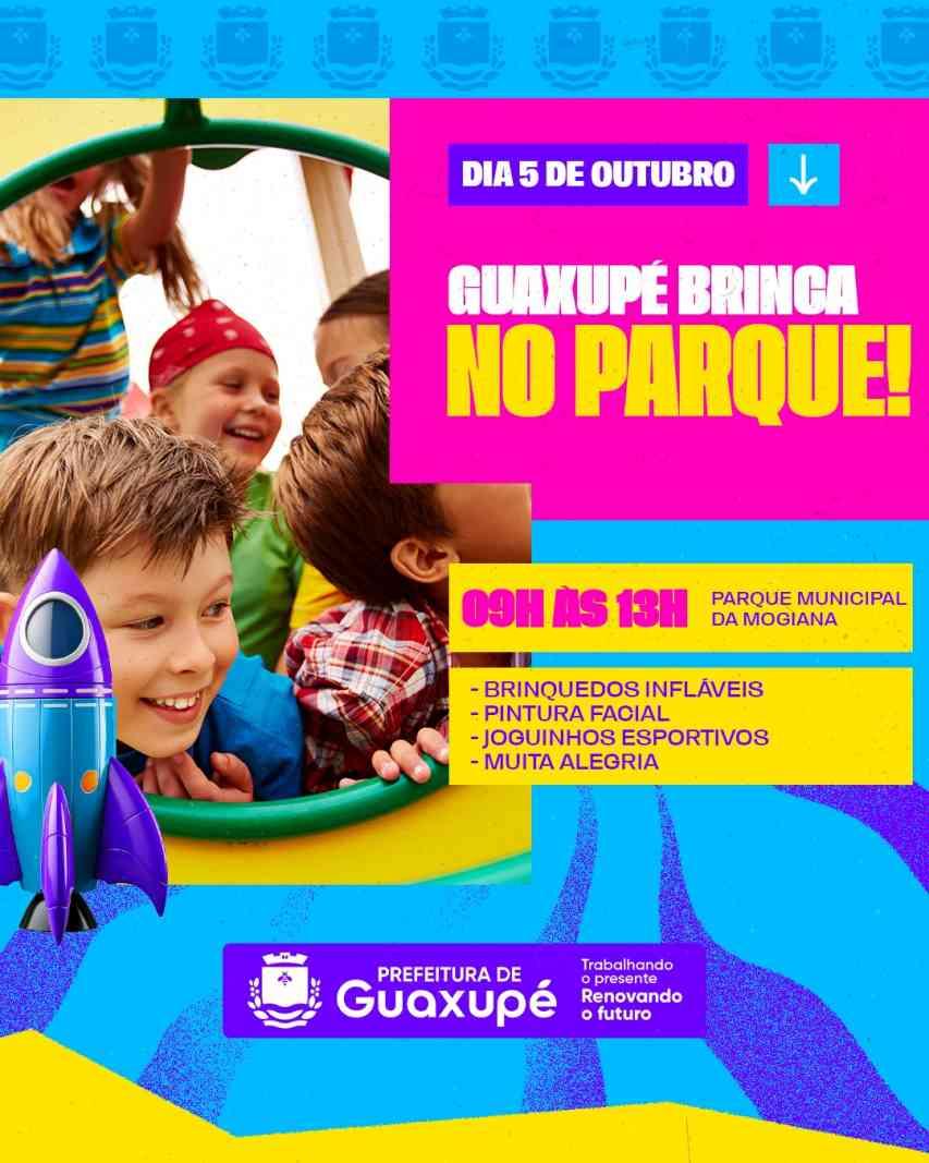 No próximo dia 5 de outubro, Guaxupé terá uma programação especial em comemoração ao Dia das Crianças. O evento “Guaxupé Brinca no Parque” acontecerá das 9h às 13h, no Parque Municipal da Mogiana, reunindo diversas atividades de lazer para toda a comunidade.