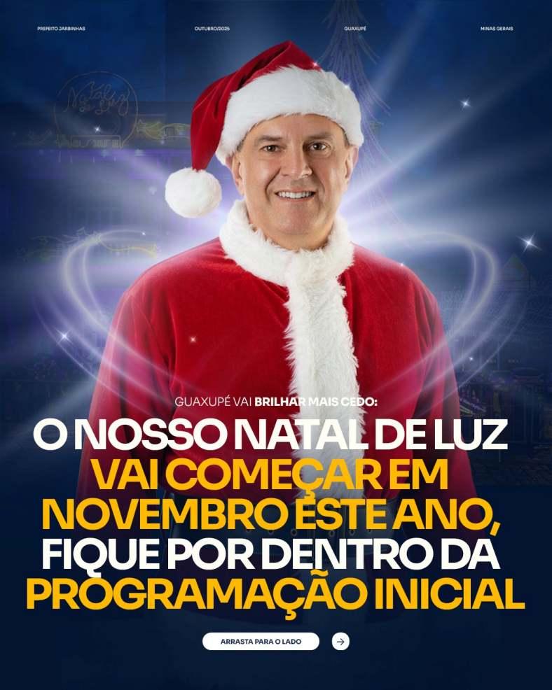 O prefeito de Guaxupé, no Sudoeste mineiro, Jarbas Correa Filho (Jarbinhas), iniciou a semana de trabalho nesta segunda-feira, 13 de outubro, já em clima de anunciação do "Natal de Luz 2025". Idealizador do referido acontecimento, ainda em 2013, no início de seu primeiro mandato, o gestor público tem, esse ano, a expectativa de promover uma das melhores edição do evento, que começará oficialmente no próximo dia 1º e se estenderá até o início de 2026.