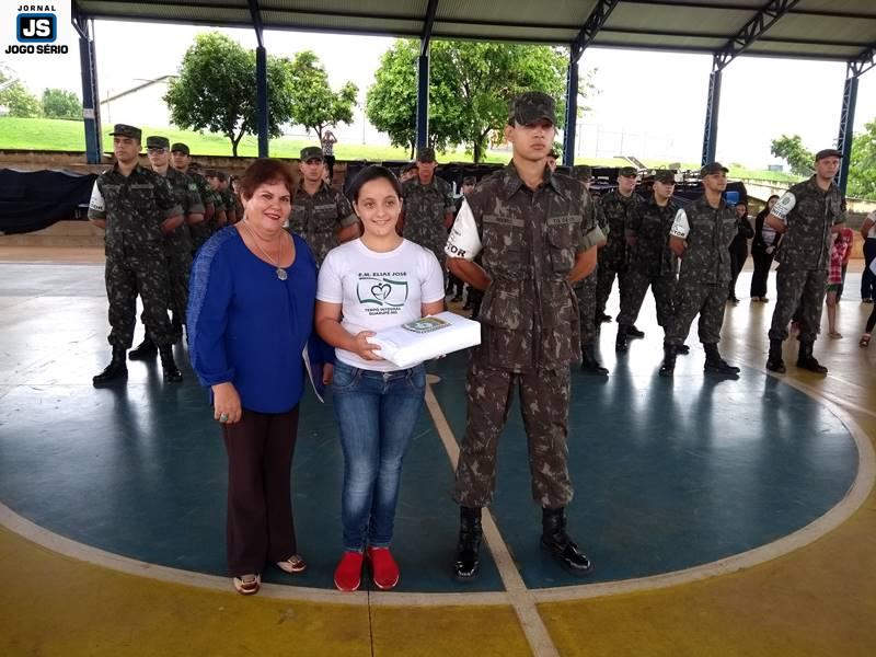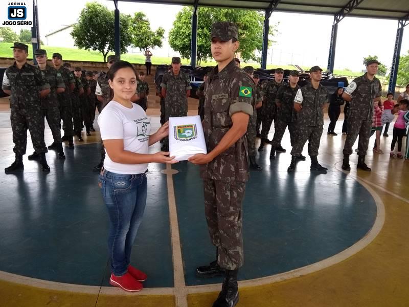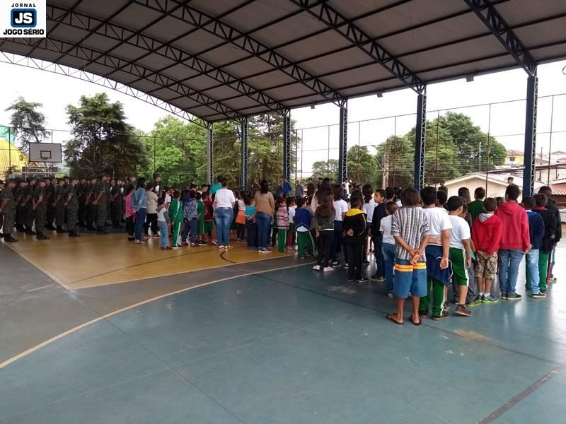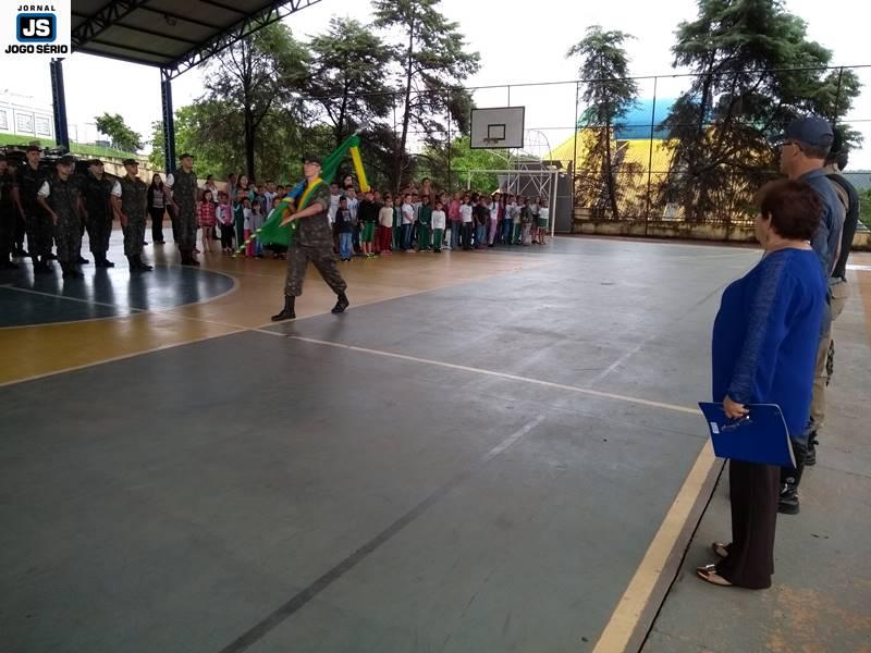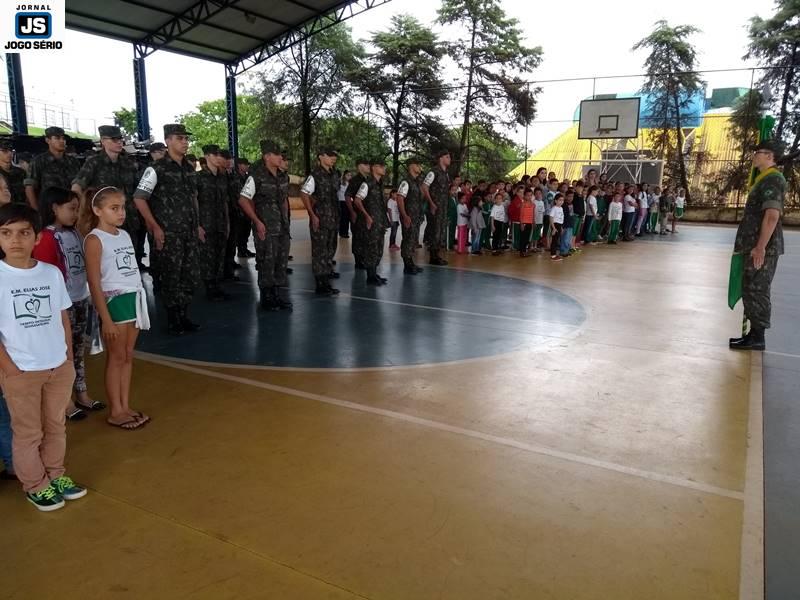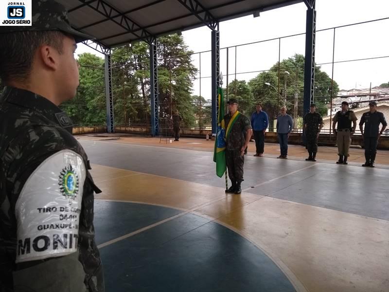 O Tiro de Guerra de Guaxupé realizou, nesta manhã de segunda-feira, 19 de novembro, uma solenidade especial pelo “Dia da Bandeira”, tendo a comemoração ocorrido na quadra poliesportiva da Escola Municipal Elias José – CIEG. Parte do projeto “Momento Cívico nas Escolas”, a visita dos militares à instituição foi assistida por centenas de estudantes, os quais interagiram com os soldados, durante as várias demonstrações de Ordem Unida e amor à Pátria. Cada vez mais atuante, a turma deste ano do “TG” tem realizado várias ações fora da instituição, as quais vão ao encontro do envolvimento direto com a sociedade.