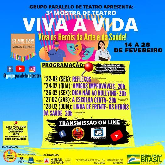 Você acompanha as manifestações artísticas da "3ª Mostra de Teatro Viva a Vida - viva os heróis da arte e da saúde" nas plataformas digitais do Grupo Paralelo: @grupoparalelodeteatro - para facebook e instagram - e na fanpage/facebook do Jornal JOGO SÉRIO.