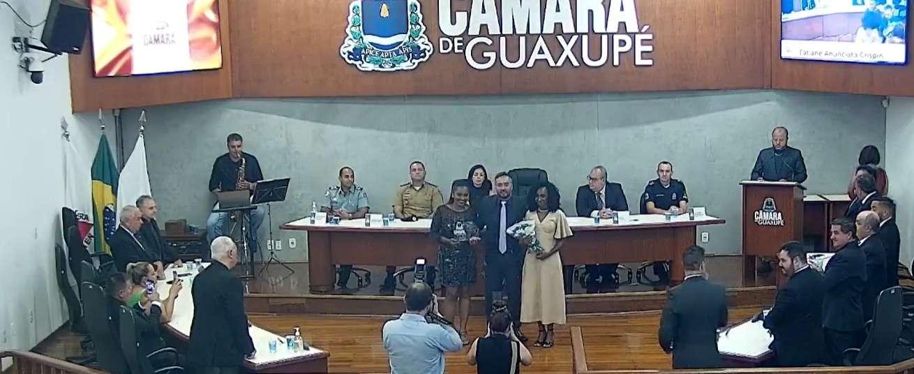 Vereadores de Guaxupé, no Sudoeste mineiro, promoveram, nesta noite de quarta-feira, 13 de dezembro, a sessão solene de entrega de títulos de Honra ao Mérito a cidadãos e membros de instituições locais, por conta de seus relevantes préstimos à sociedade. A solenidade foi realizada na sede do Legislativo, num cerimônial conduzido pelo professor e músico Ítalo Coragem Honório. Já a mesa diretora foi ocupada pelo presidente da Câmara, Danilo Martins de Oliveira, a juiza de Direito, Dra. Cristiane Vieira Tavares Zampar, o comandante da 79ª Cia. PMMG, capitão Cláudio Torres, o dirigente do 2º Pelotão do Corpo de Bombeiros, tenente Josué Pereira, o secretário municipal de Governo, Dr. Renato Carlos de Gouvea (representante do prefeito, Dr. Heber Hamilton Quintella), e o comandante da Guarda Civil Municipal, Alexandre Prado Inocêncio.