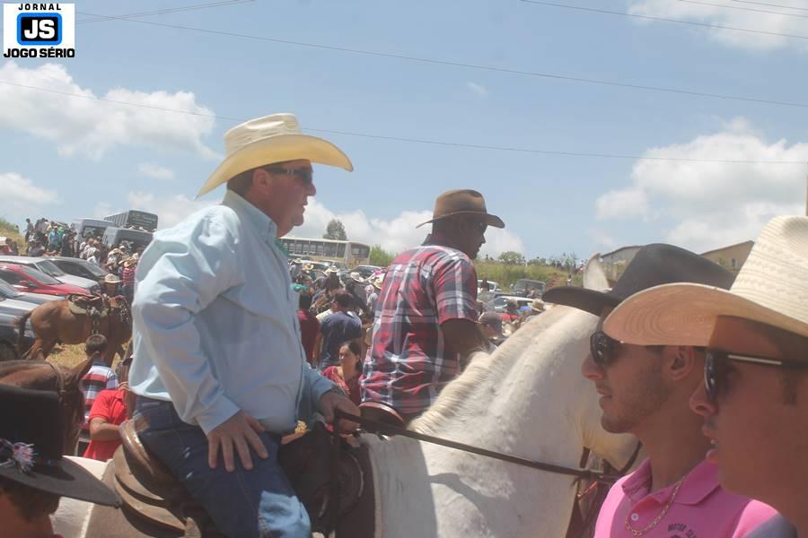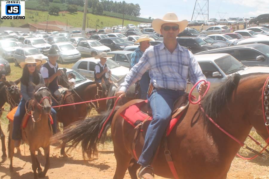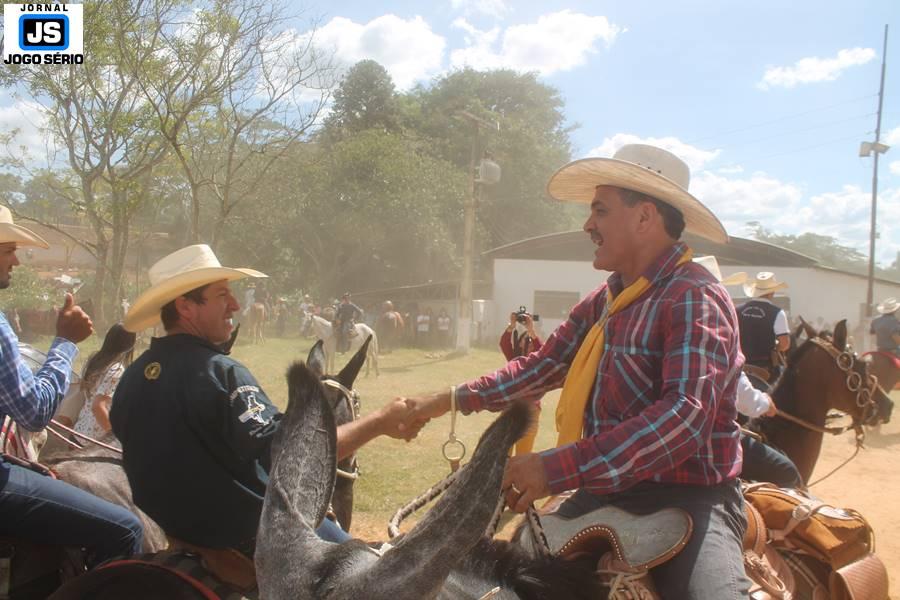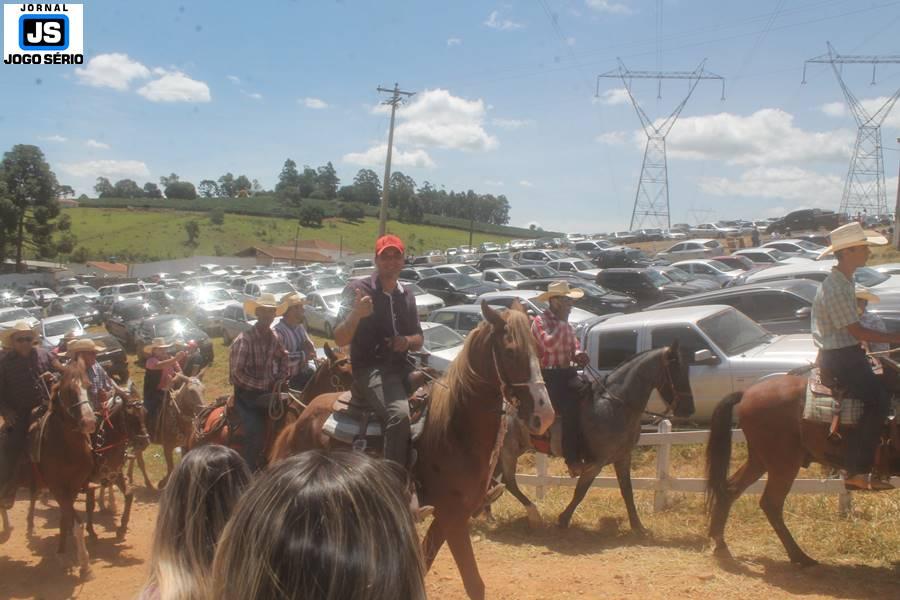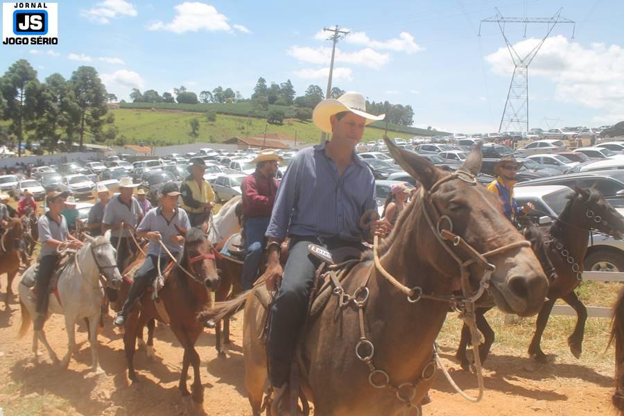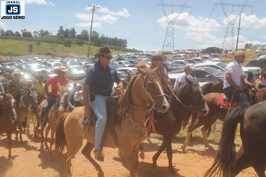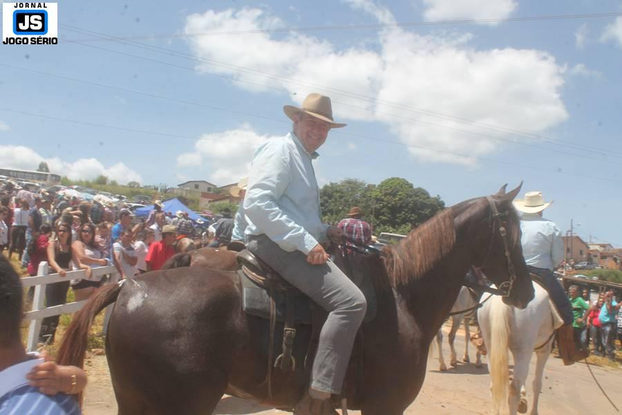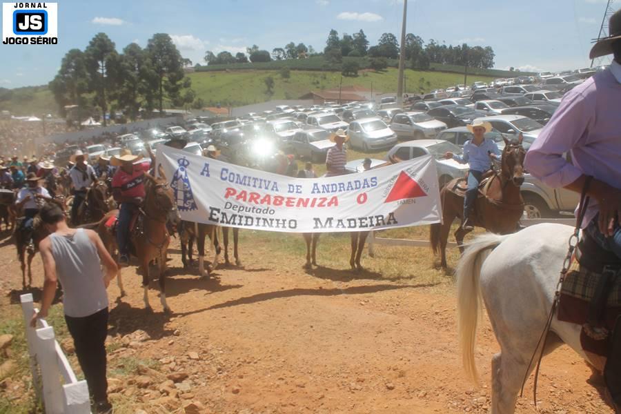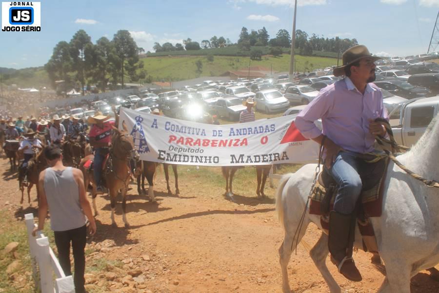 Com o dia ensolarado e a multidão animada, milhares de cavaleiros e amazonas desfilaram pela cidade, numa cavalgada com mais de dois mil e quinhentos animais. Atrativo especial para a cidade, o passeio foi acompanhado de perto por famílias inteiras, as quais apreciavam a referida cultura popular. De volta ao recinto do aniversário, Emidinho Madeira recebeu mais demonstrações carinho, tendo inclusive sido formada uma extensa fila de pessoas interessadas em cumprimentá-lo: "Estamos prestigiando o Emidinho e vendo esta gente bonita nesta festa. O Emidinho, sempre como deputado, é bastante atuante. Há poucos dias, ele fez uma participação nas nossas demandas para o Hospital, liberando uma verba de R$ 215 mil e, tanto eu, como prefeito, quanto a população, está muito agradecida a ele", Adeberto José de Melo (Deco do Estalo), prefeito de Piumhi. "É o maior prazer estar nesta festa do Emidinho, que é muito importante em vários aspectos: como político, pessoa, para a família dele e, enfim, é um homem que está deixando um ótimo exemplo para o Sul de Minas. É um homem humilde, de trabalho, que veio da agricultura e terá um bom futuro na região, se Deus quiser", comentou José Dias de Melo, prefeito de Ipuiuna. "Eu trago aqui o abraço também do governador Fernando Pimentel a nosso amigo, Emidinho Madeira. Não é todo dia que uma pessoa faz 50 anos e, tenho certeza, que desde que ele se entende por gente, em condições de trabalhar, tem feito de sua vida um espaço de serviço ao próximo e é por isto que temos tantas pessoas aqui hoje. E é com este sentimento que trago o abraço do governador e o meu próprio, obviamente", externou o deputado federal Odair Cunha, que desfilou na cavalgada. "Para nós, é um motivo de muita festa e alegria comemorar os 50 anos de Emidinho Madeira. É uma data inesquecível para ele e todos nós, seus companheiros de luta no dia-a-dia. A gente vê a alegria contagiante que sai do sorriso dele e, para nós, também é motivo de muita alegria estar aqui com Nova Resende e a região. A todos, nossas boas vindas!", recepcionou o prefeito de Nova Resende, Celson José de Oliveira.