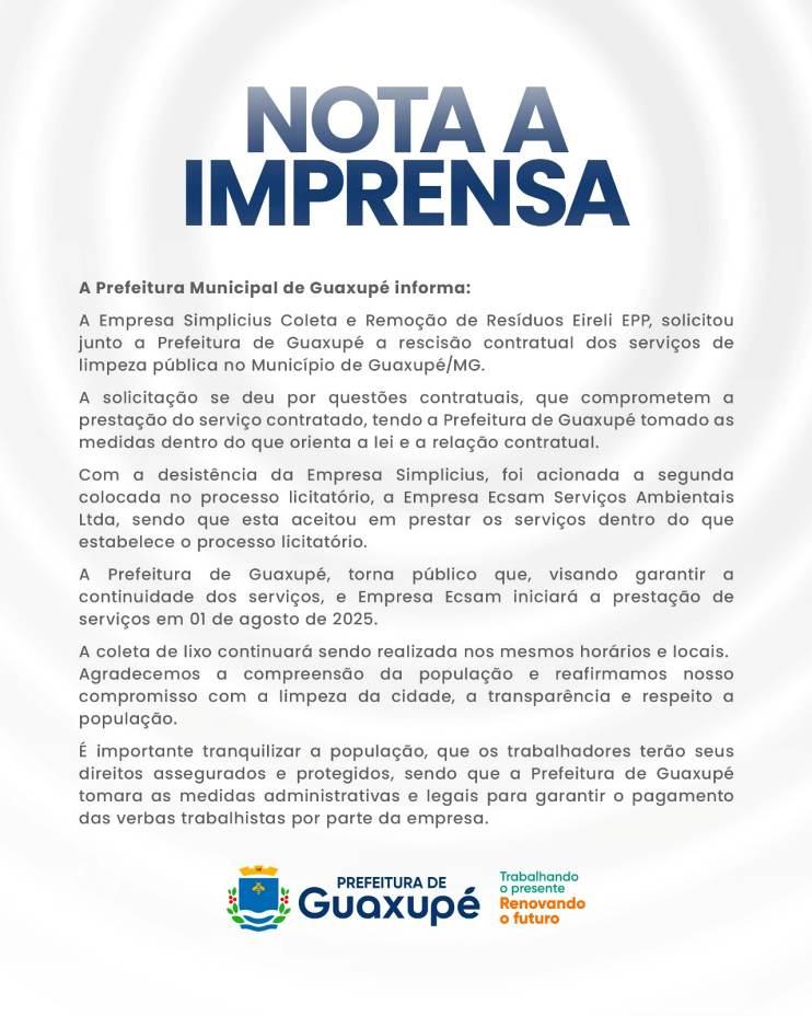 Ainda no início da noite de hoje, a Prefeitura divulgou, por meio de suas redes sociais, nota oficial sobre o assunto. Em seu conteúdo, o governo municipal divulgou: "A Prefeitura de Guaxupé informa que a empresa Simplicius solicitou a rescisão contratual dos serviços de limpeza pública no Município. Para garantir a continuidade dos serviços, a empresa ECSAM assumirá a coleta de lixo a partir de 1º de agosto de 2025, mantendo os mesmos horários e locais. Reforçamos nosso compromisso com a limpeza urbana, a transparência e o respeito à população. Os direitos dos trabalhadores também estão sendo resguardados (veja, na parte de fotos dessa matéria, a íntegra da nota publicada nas redes sociais da Prefeitura). - AJUDE O jornal que lhe informa a todos os momentos: faça um PIX de qualquer valor para 11.086.919/0001-66. - CLIQUE AQUI e receba os conteúdos do JOGO SÉRIO em seu whatsapp. - NESSE LINK, você passa a seguir a nova fanpage/facebook Jornal JOGO SÉRIO. - A QUALQUER instante, acesse www.jornaljogoserio.com.br e fique muito bem informado.