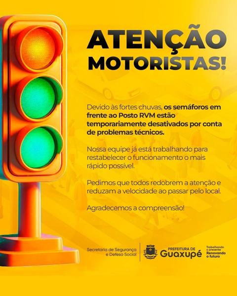 Os semáforos localizados em frente ao Posto RVM, em Guaxupé, foram temporariamente desativados após apresentarem problemas técnicos provocados pelas fortes chuvas que atingiram a cidade. Segundo a administração municipal, equipes já atuam no local para restabelecer o funcionamento normal do equipamento.