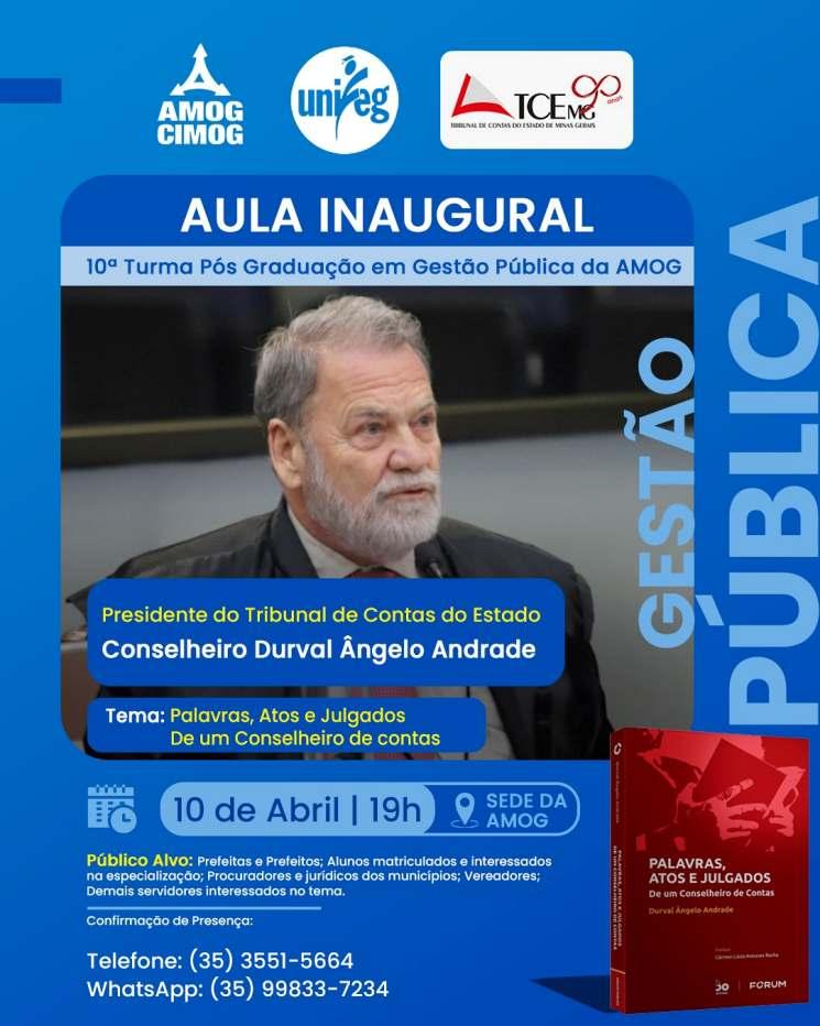 O presidente do Tribunal de Contas do Estado de Minas Gerais, Dr. Durval Angelo Andrade, ministrará, no próximo dia 10 de abril, às 19h, na sede da Amog, a palestra "Palavras, Atos e Julgados de um Conselheiro de Contas" (que intittula livro do convidado em questão). A iniciativa vai ao encontro do lançamento oficial da 10ª turma do curso de Pós-Graduação em Gestão Pública, ofertado pelo Centro Universitário da Fundação Educacional Guaxupé. A palestra é voltada aos alunos já matriculados no curso, assim como prefeitos, vereadores, procuradores jurídicos, servidores públicos, entre outros. Com vagas restritas, a aula especial depende de confirmação no telefone (35) 3551-5664 ou no whatsapp de número (35) 9-9833-7234. - AJUDE O jornal que lhe informa a todos os momentos: faça um PIX de qualquer valor para 11.086.919/0001-66. - CLIQUE AQUI e receba os conteúdos do JOGO SÉRIO em seu whatsapp. - NESSE LINK, você passa a seguir a nova fanpage/facebook Jornal JOGO SÉRIO. - A QUALQUER instante, acesse www.jornaljogoserio.com.br e fique muito bem informado.