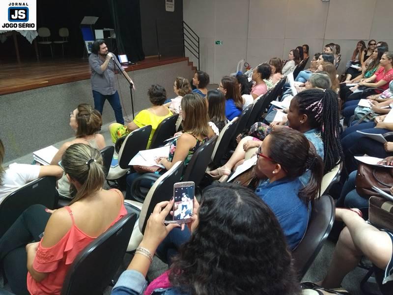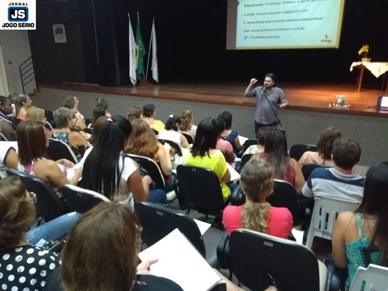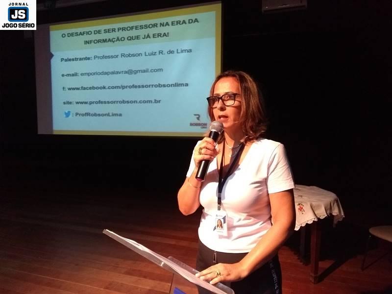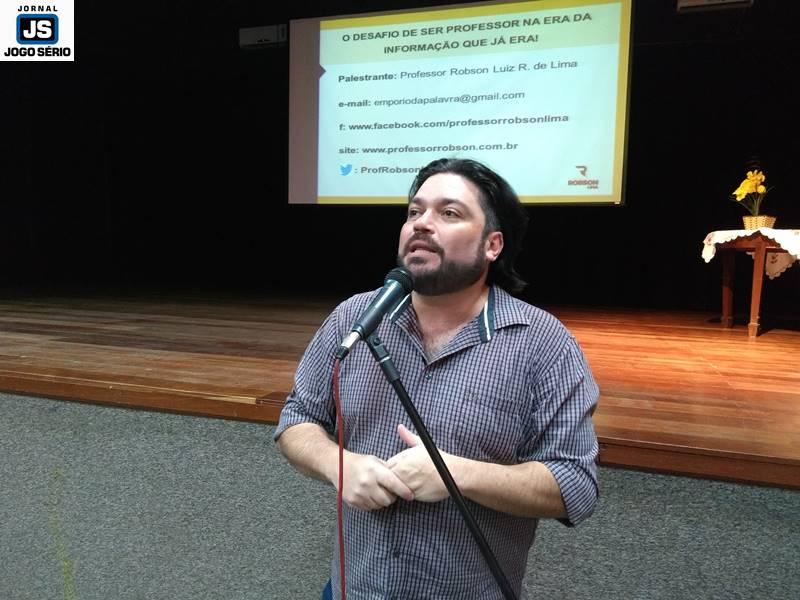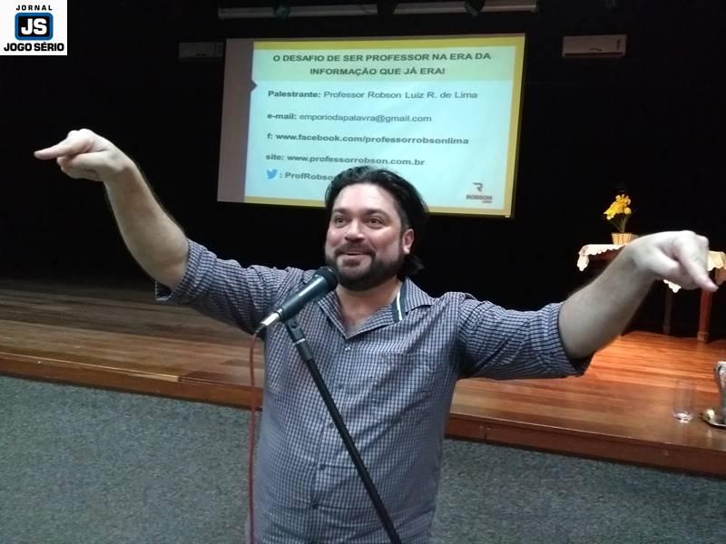 Já na segunda etapa, o evento foi dedicado à palestra “O desafio de ser professor na era da informação que já era”, com o professor Robson Luiz Lima, especialista em Educação, Língua Portuguesa, Comunicação, Literatura e Relacionamento Interpessoal, entre outros. Bastante descontraído, o educador falou por cerca de duas horas, quando enfatizou a “invasão” da tecnologia e, consequentemente, da informática, no mundo atual. Sendo assim, o professor externou seu posicionamento de que a internet é um advento fantástico, mas os usuários precisam se atentar para a utilidade dela e não serem dependentes dela. “Hoje, ninguém mais pesquisa na Barsa, por exemplo. Só se vai ao Google!”, comentou Robson, que foi muito elogiado pela performance e o conteúdo de sua palestra.