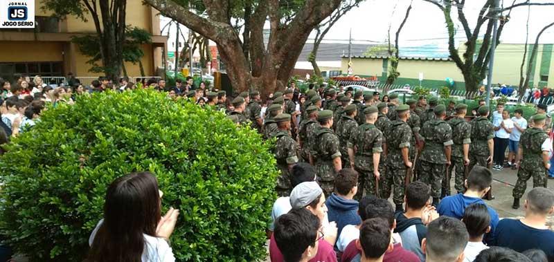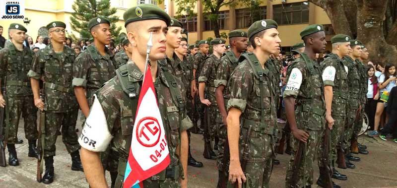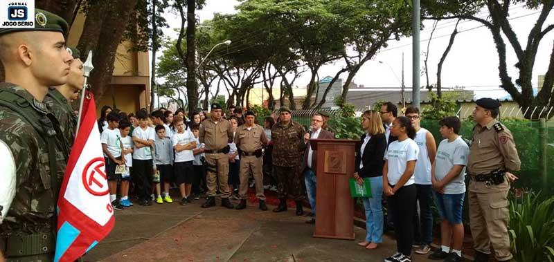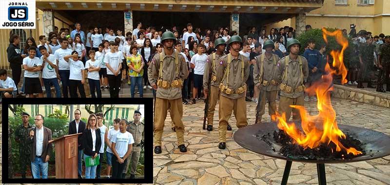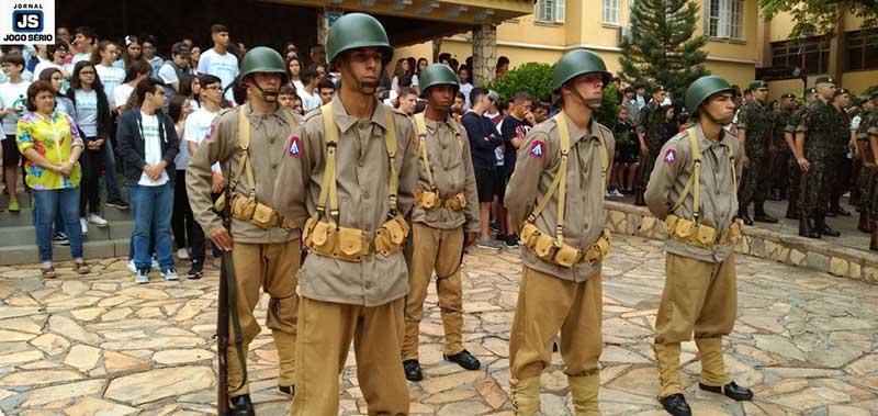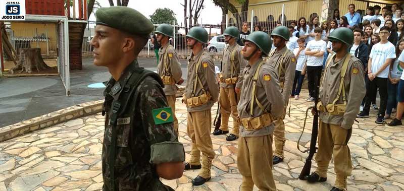 Soldados do Tiro de Guerra de Guaxupé realizaram, nesta manhã de terça-feira, 19 de novembro, uma solenidade na sede do Colégio Dom Inácio, em comemoração ao Dia da Bandeira. Proposta pelo reitor das escolas da Fundação Educacional Guaxupé, professor doutor Reginaldo Arthus, e pela diretora da referida instituição de ensino, professora mestra Juliana Cristina Costa, a iniciativa visou intensificar junto aos alunos noções de patriotismo.