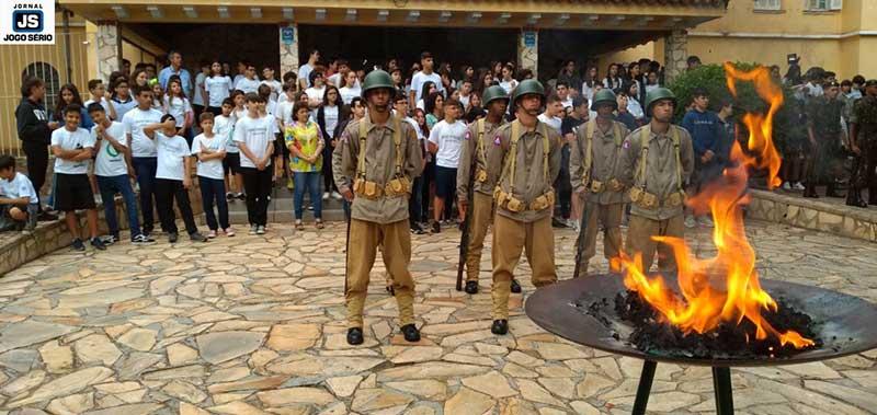 A comemoração oficial foi marcada pelas exibições de Ordem Unida, por parte dos atiradores, além do ritual da incineração de bandeira inservível e os discursos de dirigentes civis e militares. Entre eles, o chefe de instrução do TG, sargento Alex Sandro Santoro, o comandante da 79ª Cia. PM/MG, major Afrânio Tadeu Garcia, e os educadores Arthus e Juliana (os quais estiveram acompanhados pelo pró-reitor administrativo do Unifeg, professor doutor André Luiz de Andrade Melo, entre outros). Cada qual a seu modo, os explanadores ressaltaram o valor da Bandeira Nacional, enquanto símbolo do País. Mais do que isto, transmitiram aos estudantes a importância de honrar a nação, levar adiante os valores cíveis, conquistados por meio de batalhas, entre outros.