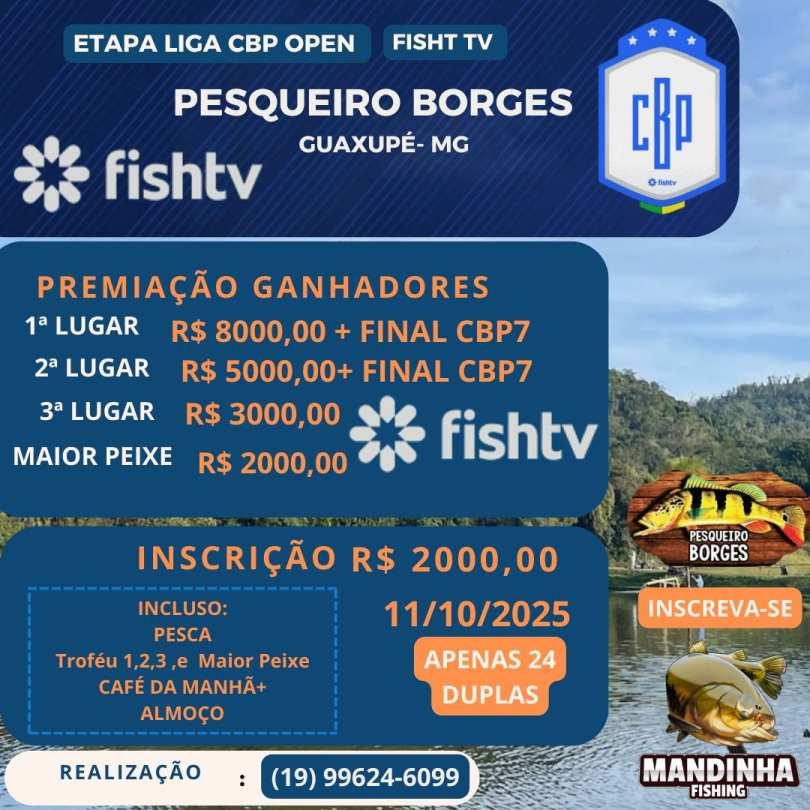 Amantes da pesca esportiva de todo o País participarão, no dia 11 de outubro, do “Campeonato Brasileiro de Pesqueiros 2025”, que acontecerá no Pesqueiro Borges, com promoção da Fish TV e a distribuição de R$ 20 mil em premiações. Responsável por atrair competidores profissionais, o evento está sendo muito aguardado não só por conta do alto nível, mas também em função dos atrativos do pesqueiro, que destaca-se pela estrutura (com pousadas, restaurantes, lagos e áreas verdes). O campeonato será disputado por vinte e quatro duplas (das 8h às 17h), as quais concorrerão aos prêmios de R$ 8 mil (aos vencedores), R$ 5 mil (aos vice-campeões), R$ 3 mil (aos terceiros colocados) e um prêmio especial no valor de R$ 2 mil ao competidor que pescar o maior peixe. Com café da manhã e almoço incluídos, o dia dos participantes do evento será marcante, dada à estrutura invejável do Pesqueiro Borges, com variadas espécies de peixes; restaurante, pousadas, entre outros atrativos. Com transmissão ao vivo pelas redes sociais da Fish TV, o Campeonato está sendo muito aguardado. Informe-se mais com José Roberto, no telefone whatsapp de número (35) 9-9710-5224. - AJUDE O jornal que lhe informa a todos os momentos: faça um PIX de qualquer valor para 11.086.919/0001-66. - CLIQUE AQUI e receba os conteúdos do JOGO SÉRIO em seu whatsapp. - NESSE LINK, você passa a seguir a nova fanpage/facebook Jornal JOGO SÉRIO. - A QUALQUER instante, acesse www.jornaljogoserio.com.br e fique muito bem informado.