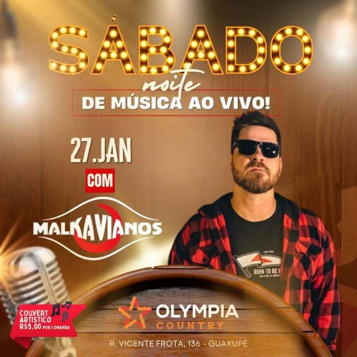 O conjunto musical Malkavianos exibe espetáculo no Olympia Country nesta noite de sábado, 27 de janeiro, para o público da cidade e região. Com ambientes adequados para adultos e crianças (espaço kids, com brinquedos eletrônicos), o local dispõe, ainda, de restaurante e diferentes opções de lazer e divertimento. Com reservas de mesas disponíveis no (35) 9-9213-0001. Para saber mais, CLIQUE AQUI.