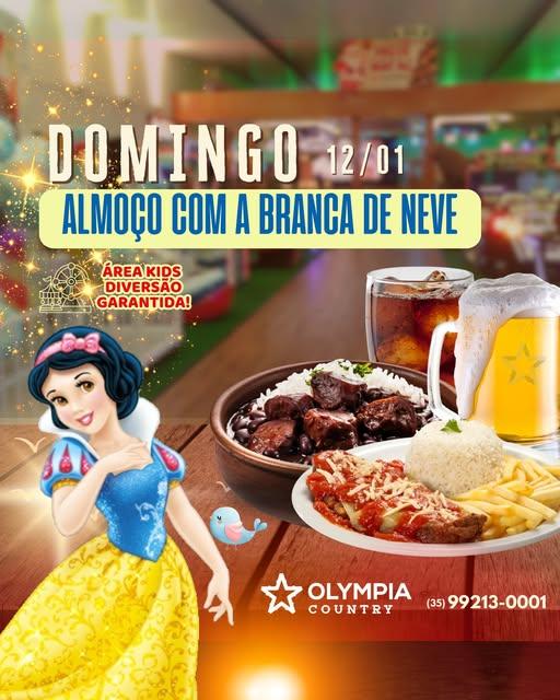 Além das delícias de seu restaurante, o Olympia destaca a presença da "Branca de Neve", que animará o ambiente, já enriquecido pelo parque de diversões, com brinquedos eletrônicos e monitores capacitados. "Venha curtir um almoço especial que vai deixar seu domingo inesquecível!" convida a direção do Olympia Country, que fica na Rua Vicente Frota, nº 136; reservas de mesas pelo telefone whatsapp de número (35) 9-9213-0001.