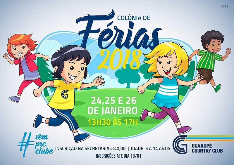 Encontram-se abertas as inscrições para a “Colônia de Férias Guaxupé Country Club 2018”, que acontecerá entre estes dias 24, 25 e 26 de janeiro, das 13h30 às 17h, na sede da entidade. O evento, que vai se compor por uma série de atividades, tem como público-alvo crianças e pré-adolescentes de 5 a 14 anos. Os interessados devem se inscrever na secretaria do clube até 10 de janeiro (o custo será de R$ 40,00) e garantir a diversão de seu ente querido. Informe-se, ainda, no site oficial: www.guaxupecountryclub.com.br.