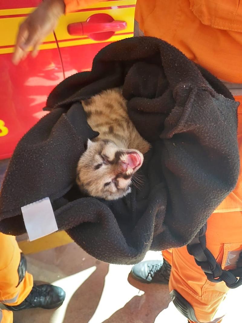 A onça-parda (Puma concolor), também conhecida como suçuarana, leão-baio ou pantera-parda, é um dos maiores felinos das Américas. Os filhotes nascem com manchas escuras no corpo — característica que pode causar confusão com outras espécies como a onça-pintada ou a jaguatirica. No caso do animal resgatado, estima-se que ele tenha aproximadamente uma semana de vida.