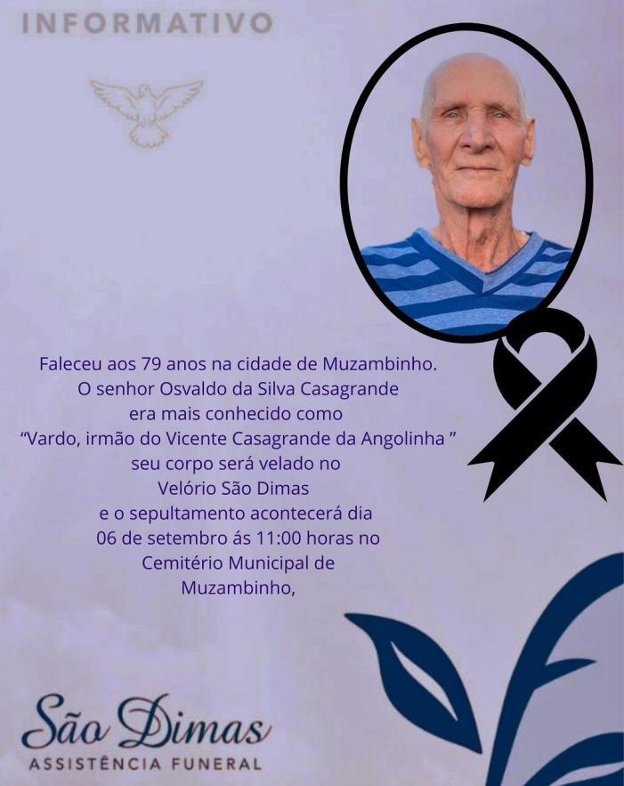 A Funerária São Dimas informa o falecimento de Osvaldo da Silva Casagrande (Vardo, irmão do Vicente, da Angolinha), aos 79 anos de idade, ocorrido nesta sexta-feira, 5 de setembro, em Muzambinho. As últimas homenagens de corpo presente estão sendo prestadas no Velório São Dimas, com o sepultamento programado para às 11 horas deste sábado, 6, no Cemitério Municipal, com a presença de parentes e amigos. Informe-se mais sobre a Funerária São Dimas no telefone (35) 3571-1736. - AJUDE O jornal que lhe informa a todos os momentos: faça um PIX de qualquer valor para 11.086.919/0001-66. - CLIQUE AQUI e receba os conteúdos do JOGO SÉRIO em seu whatsapp. - NESSE LINK, você passa a seguir a nova fanpage/facebook Jornal JOGO SÉRIO. - A QUALQUER instante, acesse www.jornaljogoserio.com.br e fique muito bem informado.