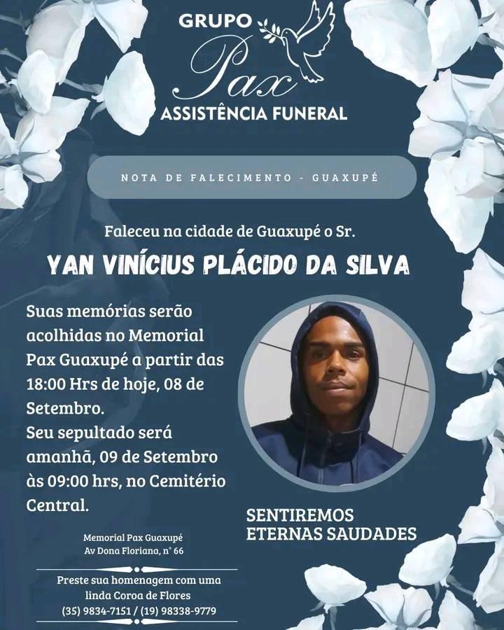 Faleceu aos 26 anos de idade, neste domingo, 7 de setembro, o guaxupeano Yan Vinícius Plácido da Silva, que era morador do Residencial Monte Verde. As últimas homenagens de corpo presente estão sendo prestadas no velório particular da Funerária PAX Guaxupé, que fica na Avenida Dona Floriana, 66, na área central. Já o sepultamento está programado para às 9 horas desta terça, 9, no Cemitério Municipal Luiz Smargiassi, com a presença de parentes e amigos. - AJUDE O jornal que lhe informa a todos os momentos: faça um PIX de qualquer valor para 11.086.919/0001-66. - CLIQUE AQUI e receba os conteúdos do JOGO SÉRIO em seu whatsapp. - NESSE LINK, você passa a seguir a nova fanpage/facebook Jornal JOGO SÉRIO. - A QUALQUER instante, acesse www.jornaljogoserio.com.br e fique muito bem informado.