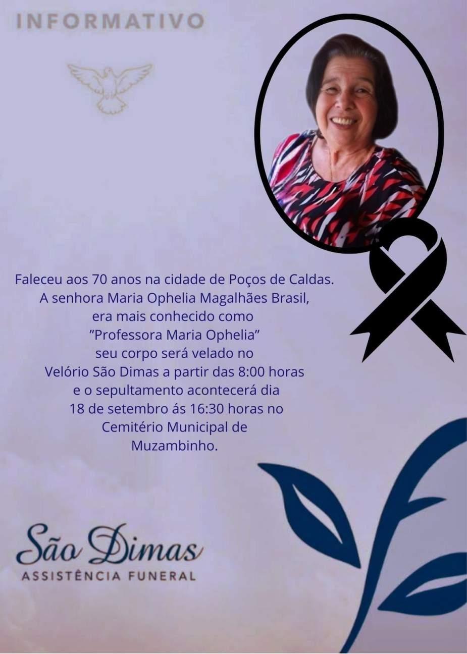 Funerária São Dimas informa o falecimento da professora Maria Ophelia Magalhães Brasil, aos 70 anos de idade, ocorrido nesta quinta-feira, 18 de setembro, na cidade de Poços de Caldas, que fica na região Sul de Minas Gerais. As últimas homenagens de corpo presente estão sendo prestadas no Velório São Dimas, em Muzambinho, no Sudoeste mineiro Já o sepultamento foi programado para logo mais às 16h30 de hoje, no Cemitério Municipal muzambinhense com a presença de parentes e amigos. Informe-se mais sobre a Funerária São Dimas no telefone (35) 3571-1736. - AJUDE O jornal que lhe informa a todos os momentos: faça um PIX de qualquer valor para 11.086.919/0001-66. - CLIQUE AQUI e receba os conteúdos do JOGO SÉRIO em seu whatsapp. - NESSE LINK, você passa a seguir a nova fanpage/facebook Jornal JOGO SÉRIO. - A QUALQUER instante, acesse www.jornaljogoserio.com.br e fique muito bem informado.