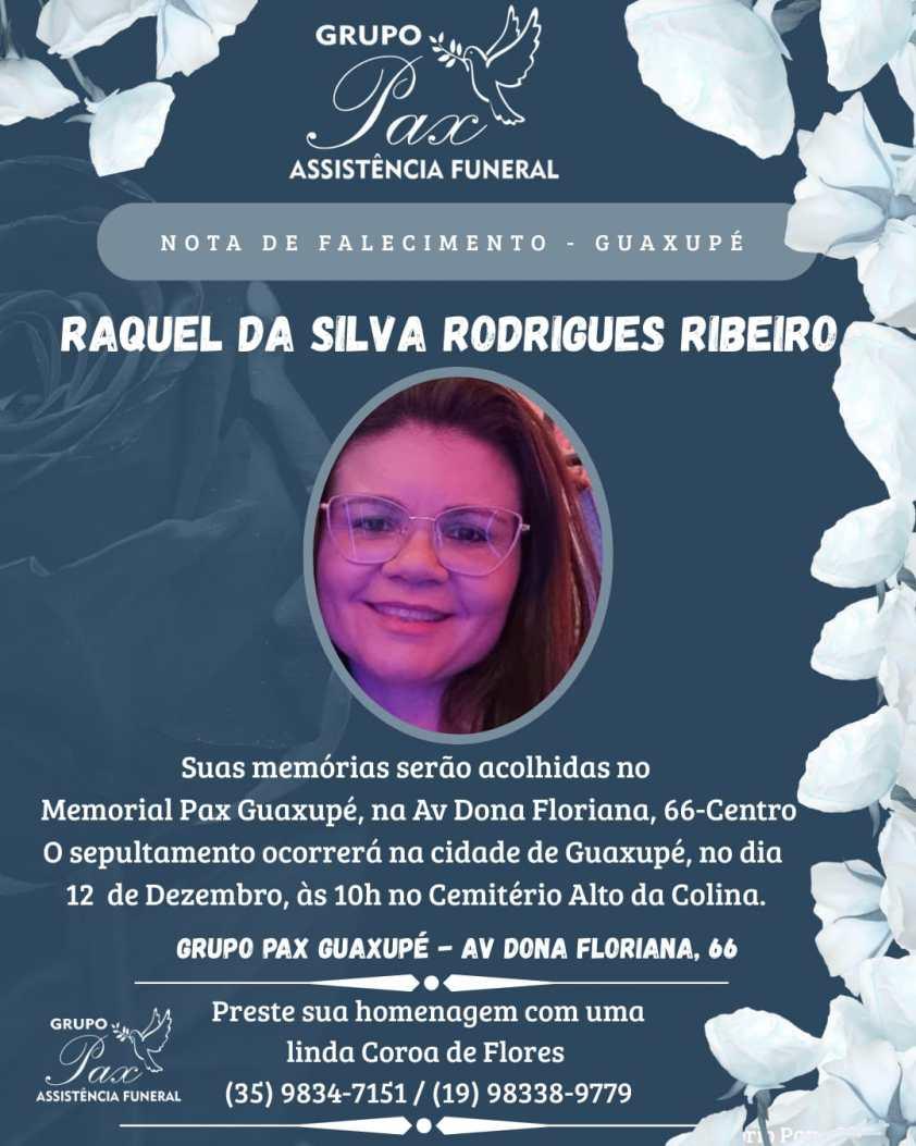 A Funerária PAX Guaxupé comunicou o falecimento da guaxupeana Raquel da Silva Rodrigues Ribeiro, aos 45 anos, ocorrido nesta quinta-feira, 11 de dezembro. As despedidas começam no velório particular do Grupo PAX, localizado na Avenida Dona Floriana, nº 66, na região central de Guaxupé. O sepultamento está marcado para às 10h desta sexta-feira, 12 de dezembro, no Cemitério Parque Alto da Colina, onde familiares e amigos poderão prestar as últimas homenagens.