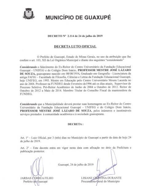 O prefeito de Guaxupé, Jarbas Correa Filho (Jarbinhas), decretou luto de três dias por conta do falecimento do ex-reitor do Centro Universitário da Fundação Educacional Guaxupé, José Lázaro de Souza. Ocorrido nesta quarta-feia, 24 de julho, o óbito do professor-mestre foi recebido com muita tristeza não só pela comunidade acadêmica, onde viveu boa parte dee sua vida, como também na cidade e região, haja vista o quanto "Zé" era bem quisto.