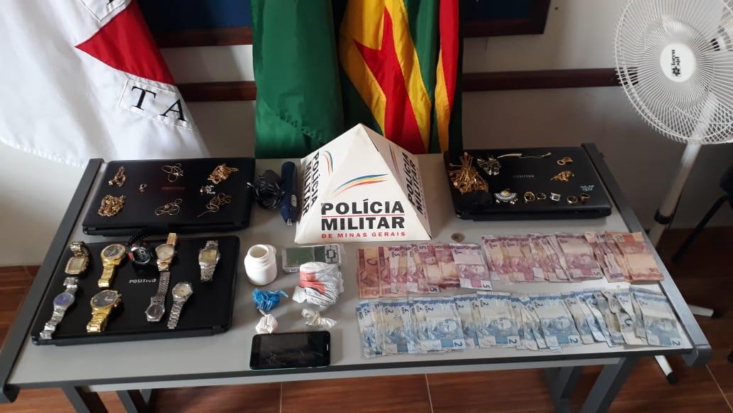Ainda nesta tarde, no município guaranesiano, conforme já divulgado pelo JOGO SÉRIO, três rapazes foram presos por suposta participação em furto a instituição de ensino, naquela cidade. Junto aos capturados, a polícia detectou quatro porções de maconha, com aproximadamente 50g, duas partes menores, com cerca de cinco gramas cada; 9g em crack, três notebooks (retirados da escola), nove relógios, onze peças entre joias e bijuterias, balança de precisão e R$ 206,00, em cédulas diversas.