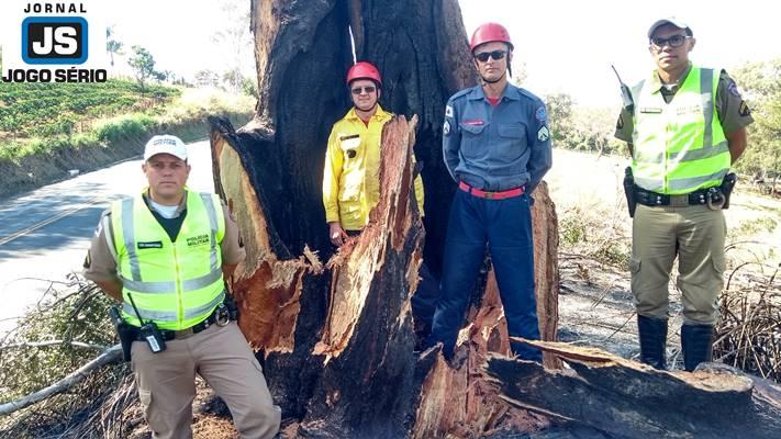 Bombeiros derrubam eucalipto gigante após queimada criminosa em Guaxupé